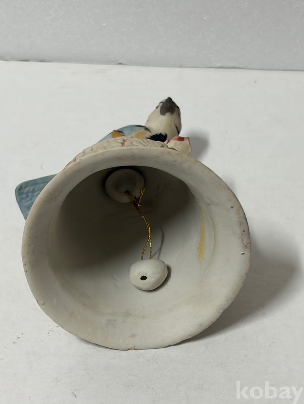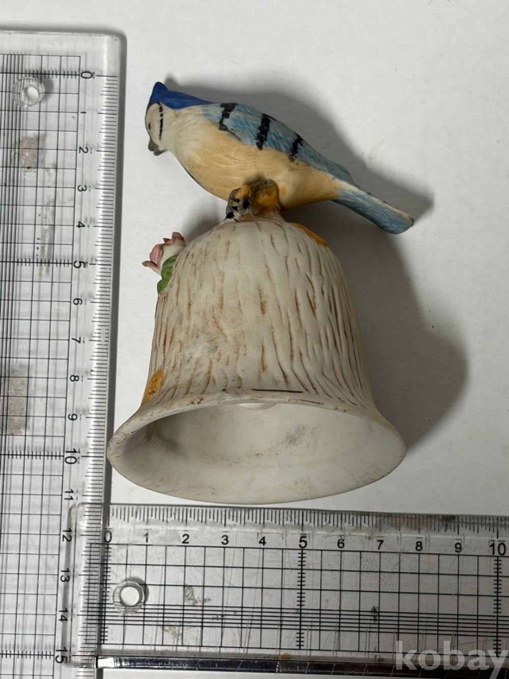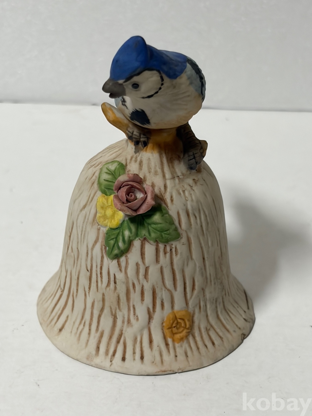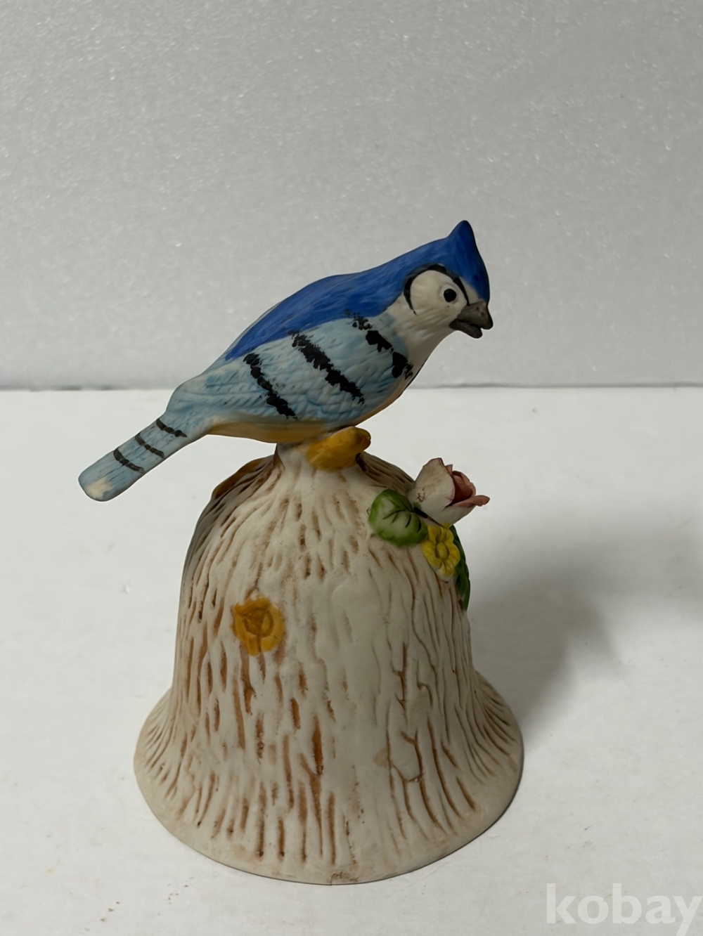 블루제이 새가 꽃과 함께 종 상단에 앉아있는 모습의 도자기 종입니다.