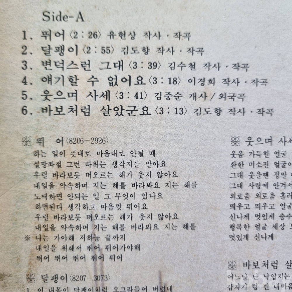 | 자켓상태 | EX : 약간의 마모, 모서리 찢김 존재 | 음반상태 | VG : 생활 기스 다수, 가벼운 노이즈 존재 | 발매정보 | 초반 | 가사지여부 | 무 |