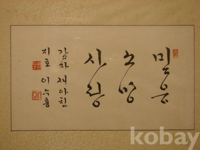 대전 심사한 지호 이수홍(芝湖 李秀弘)의 "믿음, 소망, 사랑" 글씨(21×37)입니다.