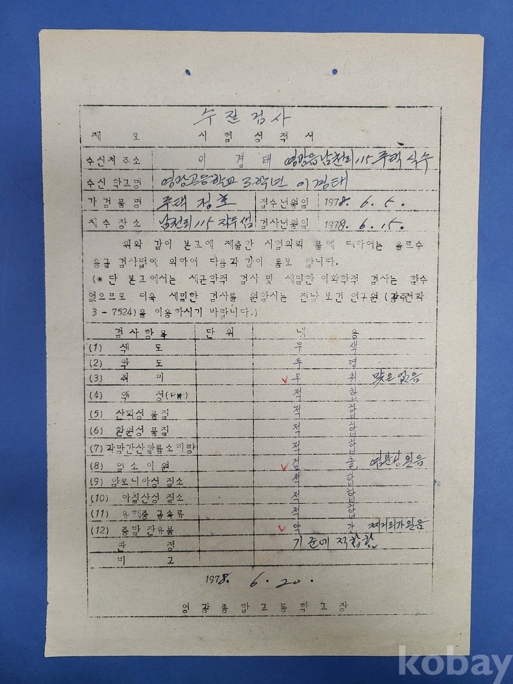 [영광 자료] 1978년 전남 영광종합고등학교 수질검사 시험성적서