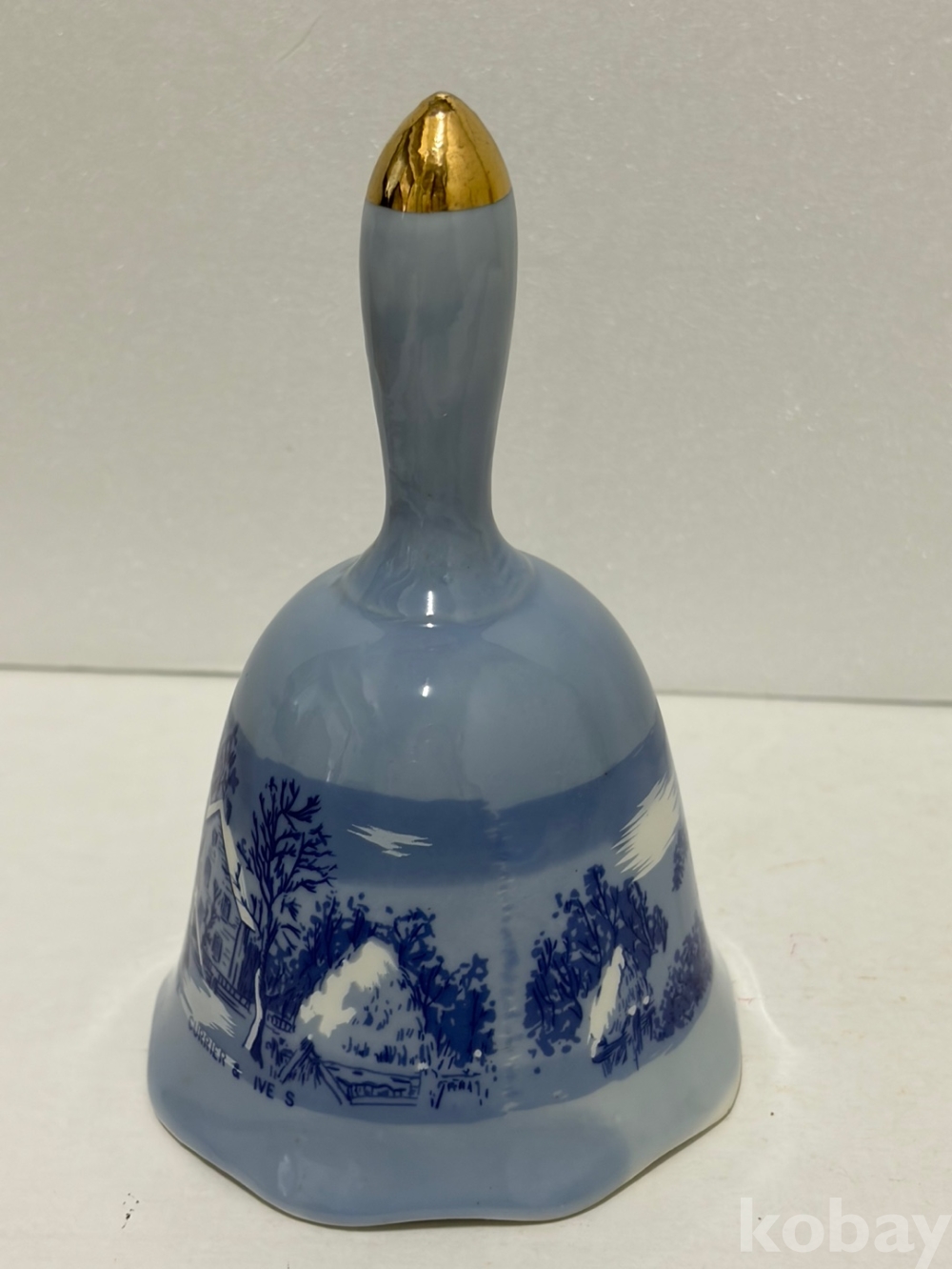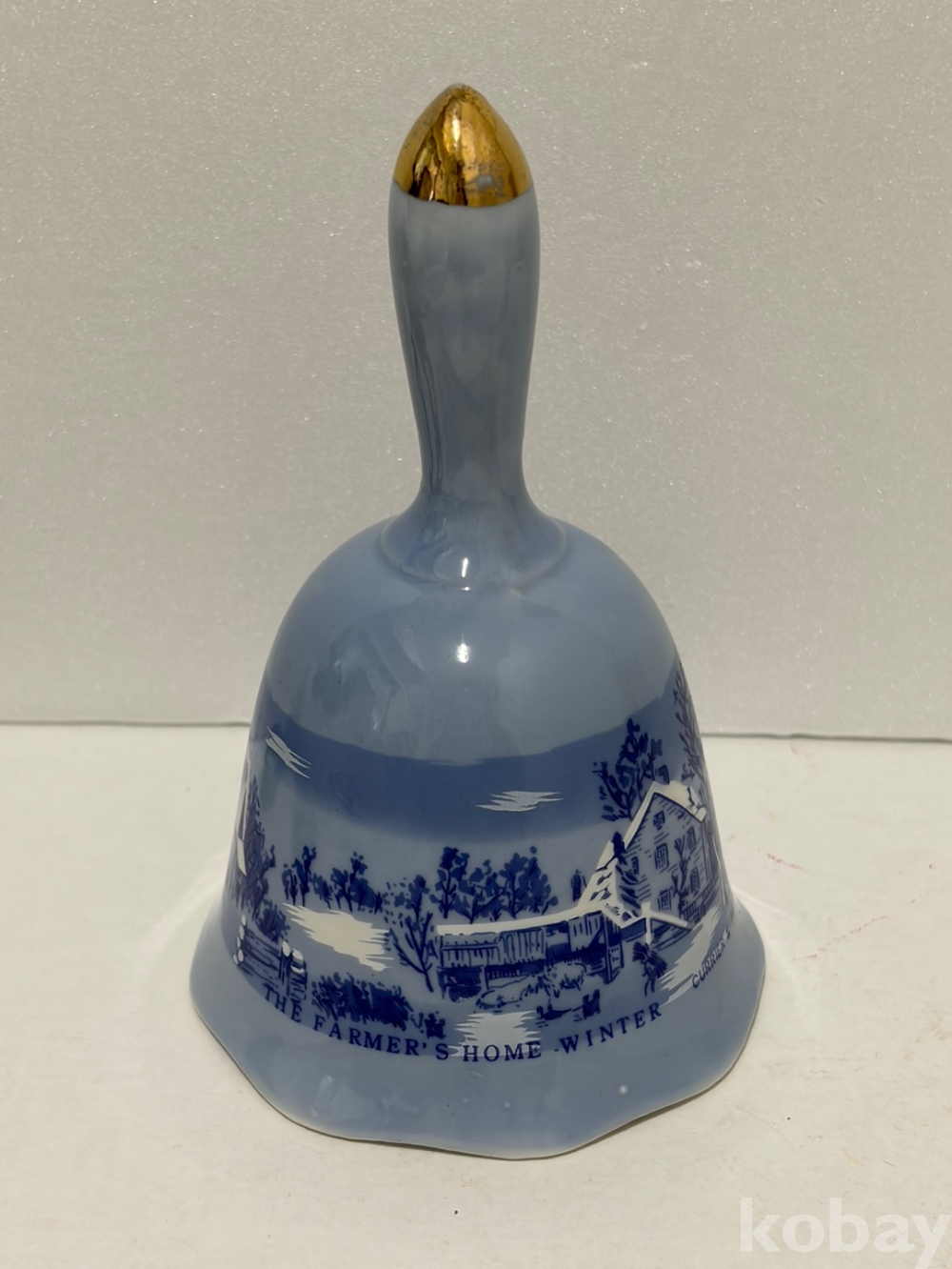 연한 파란색 유광 도자기에 눈 덮인 농가, 헛간, 나무, 울타리 등 겨울 풍경이 짙은 파란색 또는 흰색으로 묘사되어 있는 도자기 종입니다.