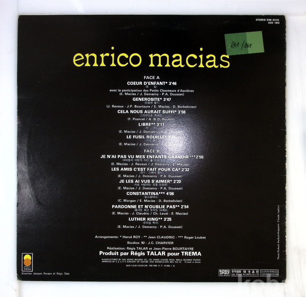| 자켓상태 | EX : 약간의 마모, 모서리 찢김 존재 | 음반상태 | EX : 재생에 영향 없는 가벼운 기스 존재 | 발매정보 | 알수없음 | 가사지여부 | 무 |