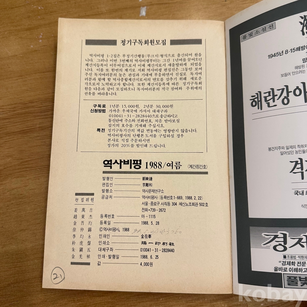 [한국현대사, 학셍운동, 사상통제법, 동학농민전쟁] 역사문제연구소, <역사비평 1988 여름>, p. 374, 상태 중급(사진참조)