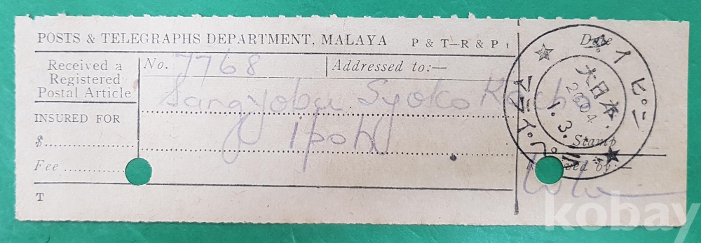 태평양전쟁시 일본점령하 말라야 전보접수증*大日本 표기와 일본연호인 2604(1944년).1.3 날짜가 쓰여진 도장이 날인되어 있다