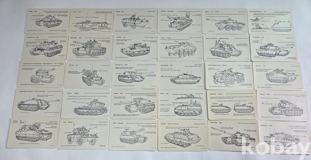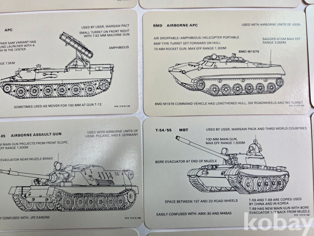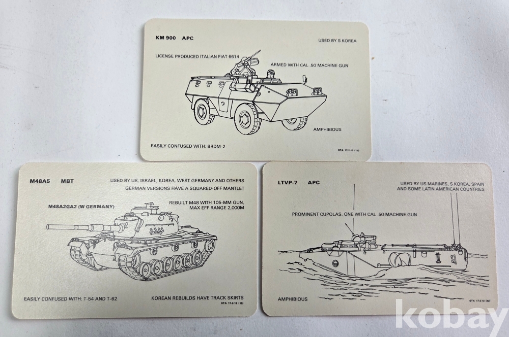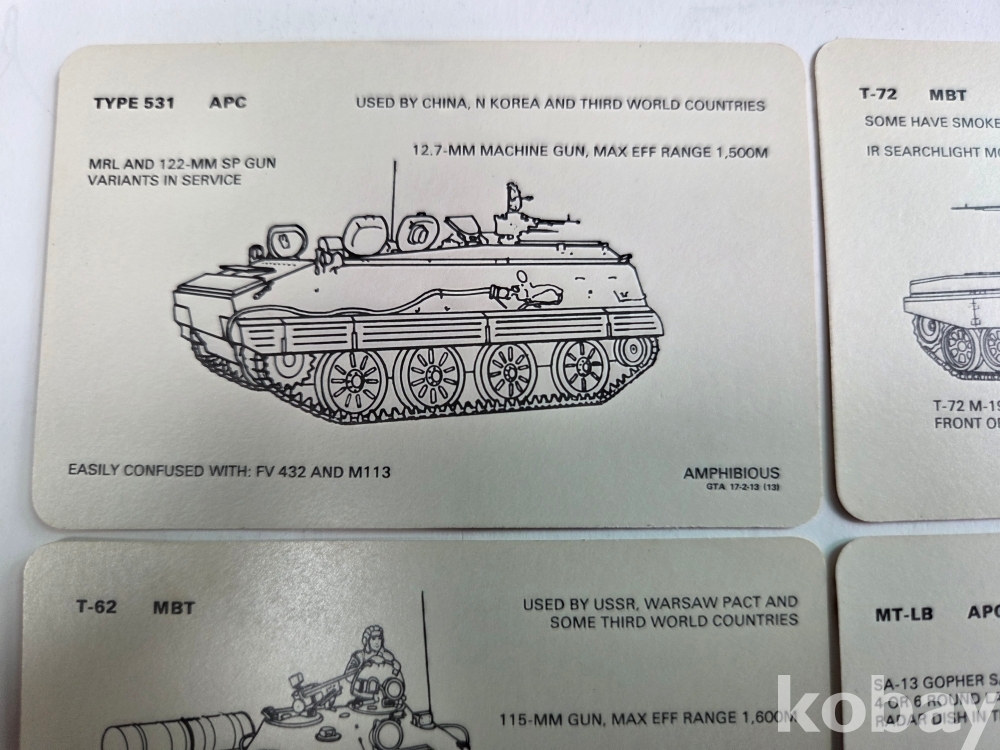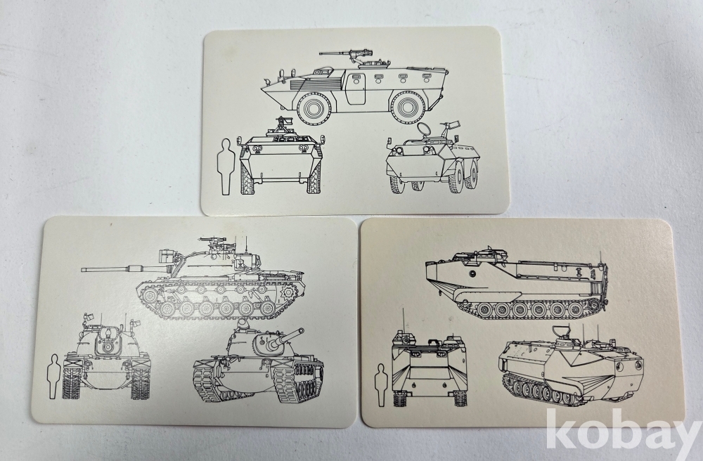 대한민국을 포함한 자유진영과 북한을 포함한 공산권의 장갑차량 50장이 수록되어있는 학습용 그림카드이며 차량의 형태 크기 무장상태를 알수 있습니다.