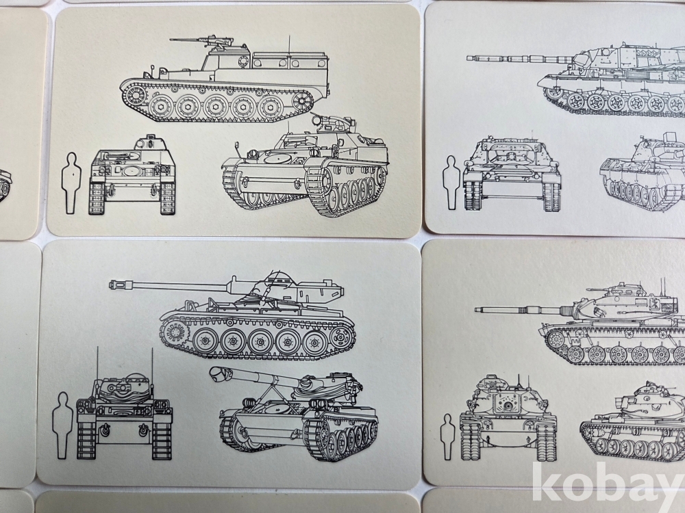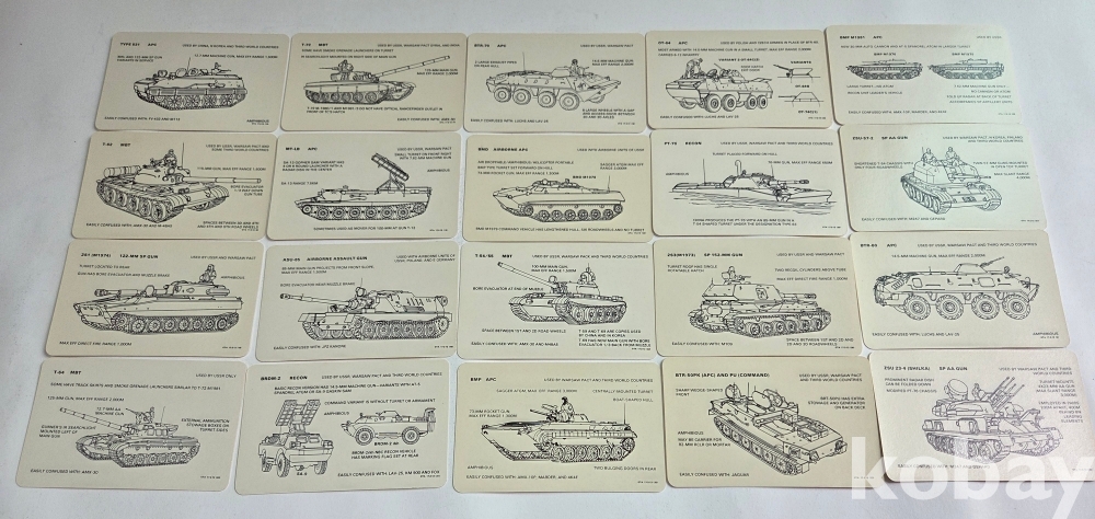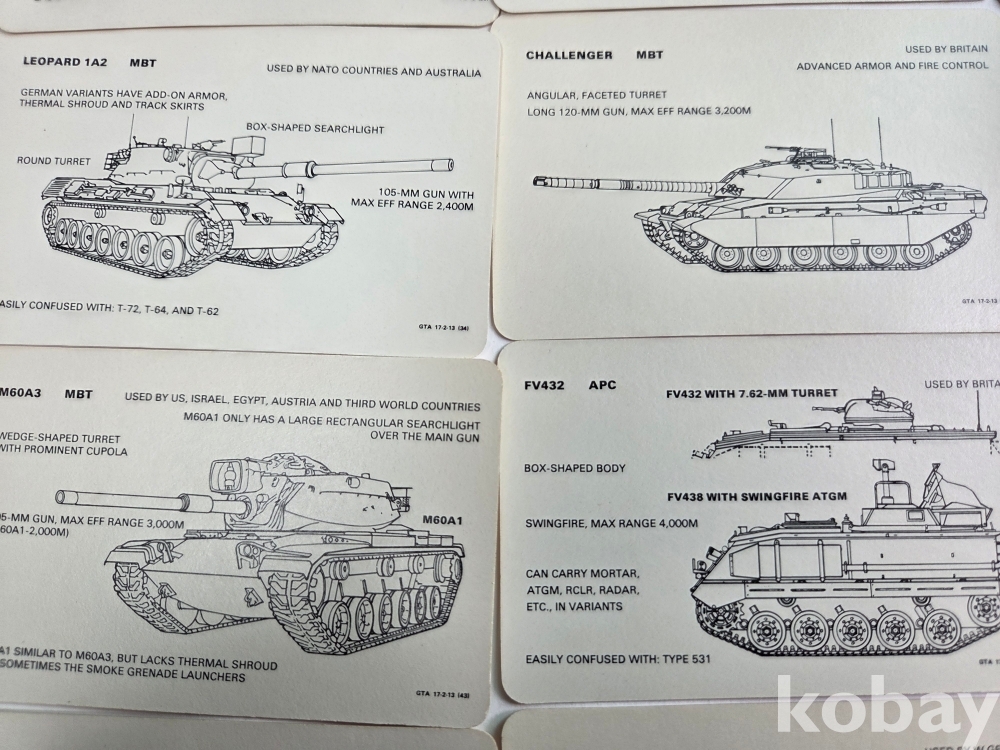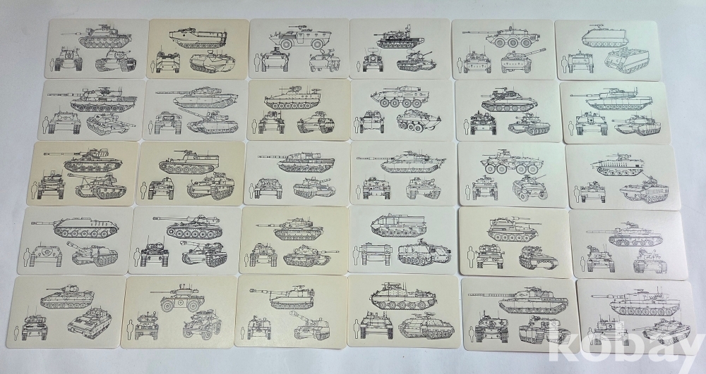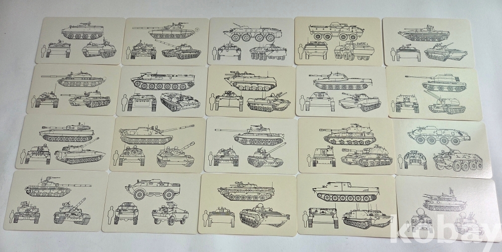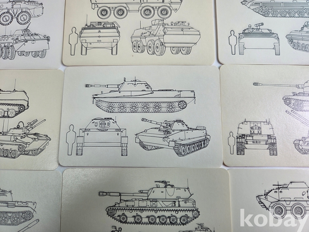 대한민국을 포함한 자유진영과 북한을 포함한 공산권의 장갑차량 50장이 수록되어있는 학습용 그림카드이며 차량의 형태 크기 무장상태를 알수 있습니다.
