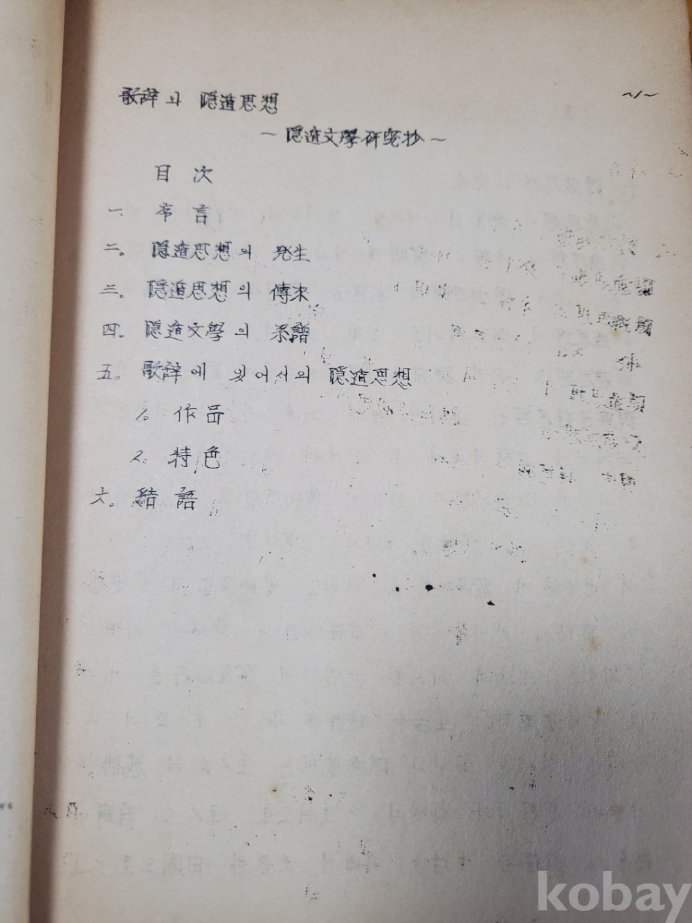 1. 가사와 은둔사상 - 은둔문학연구초, 전남대 문리대 주인식, 전남대학교 국어국문학회, 1960년대 초, 15쪽, 상태 상, 사진 참조