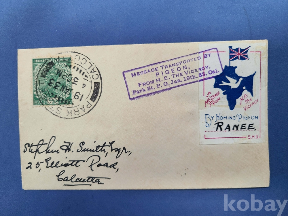 1933 Calcutta Park Street 19.JAN,33 Violet Cachet and label* A MESSAGE FROM H.E The Viceroy By Homing Pigeon RANEE S.H.S