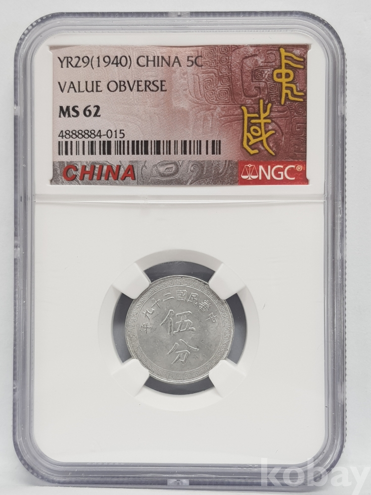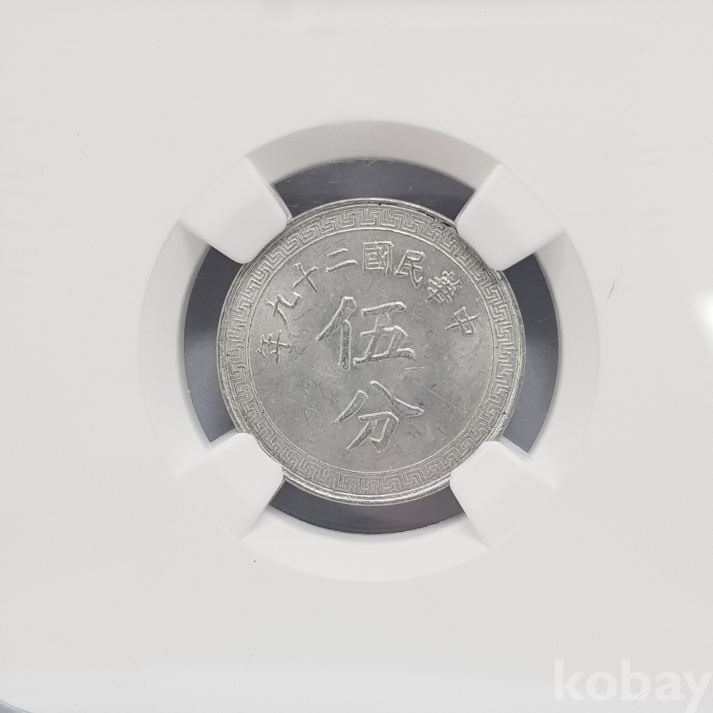 - 중화민국 1940년 5푼 NGC MS 62 그레이딩 주화