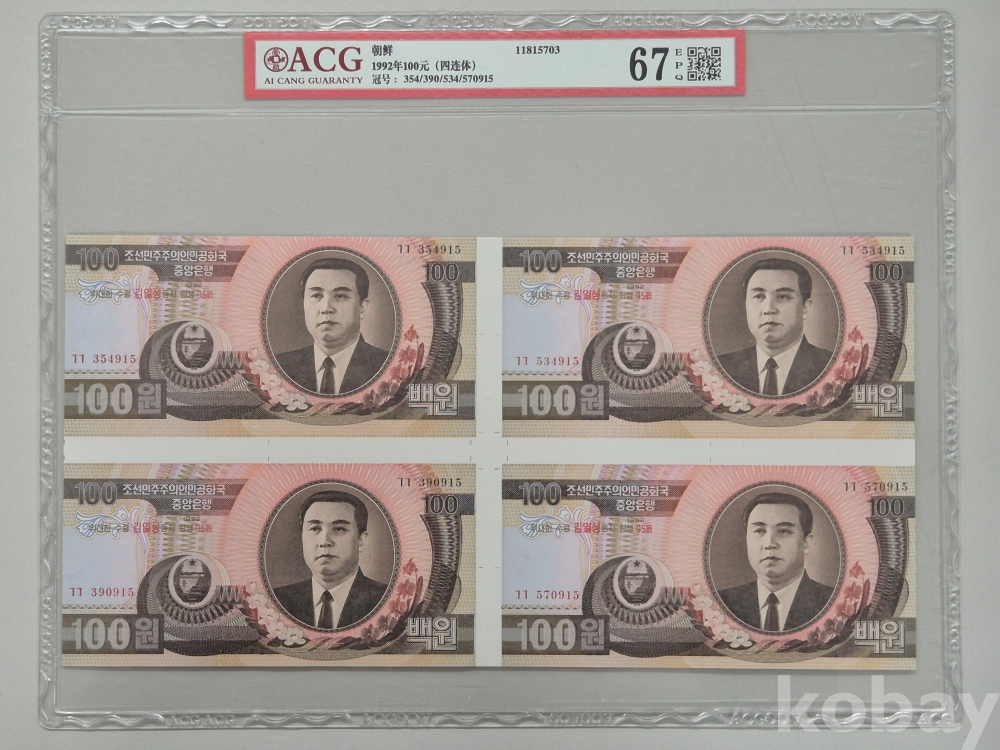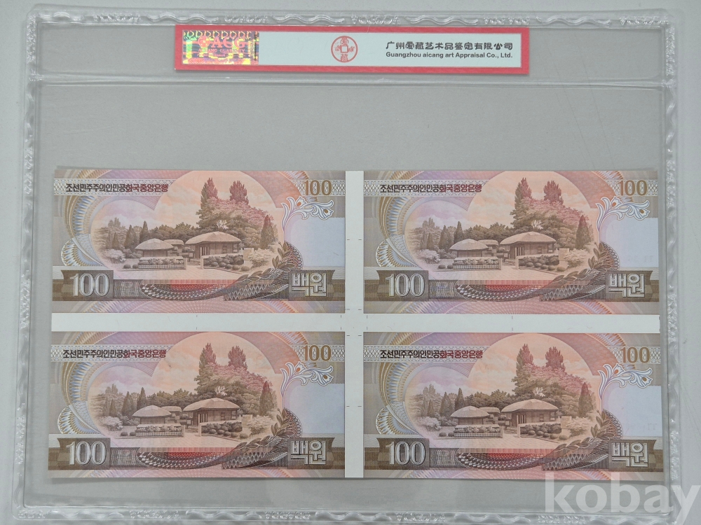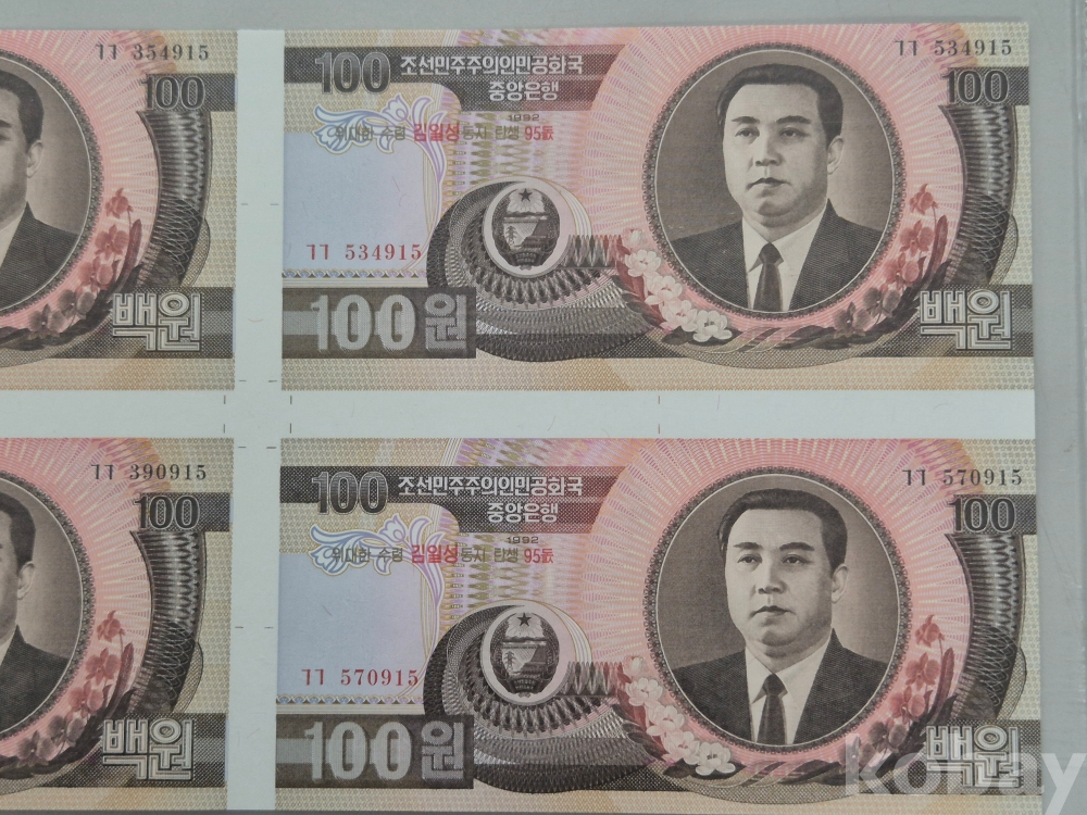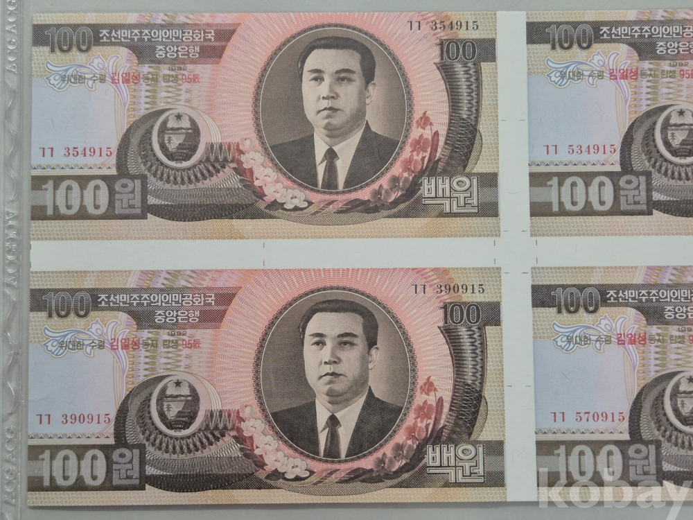 - 1992년 조선민주주의인민공화국 중앙은행에서 발행한 100원 김일성동지 탄생 95돐 4연결권 그레이딩 지폐 입니다.