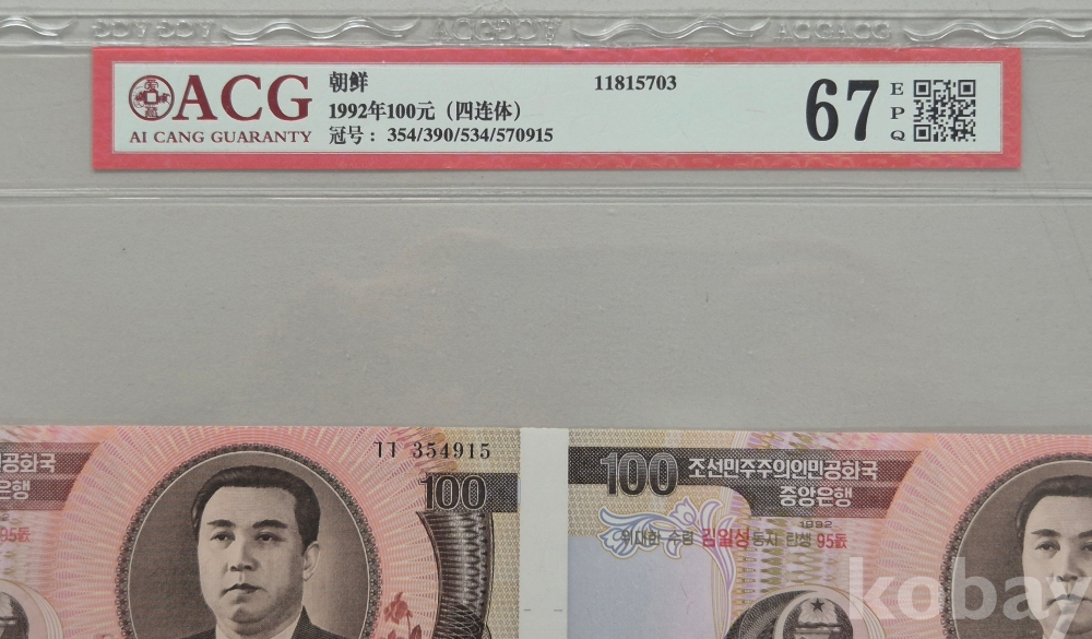 -희귀- 윗동네 1992년 백원 4연결권 ACG 67 EPQ 등급 인증 지폐