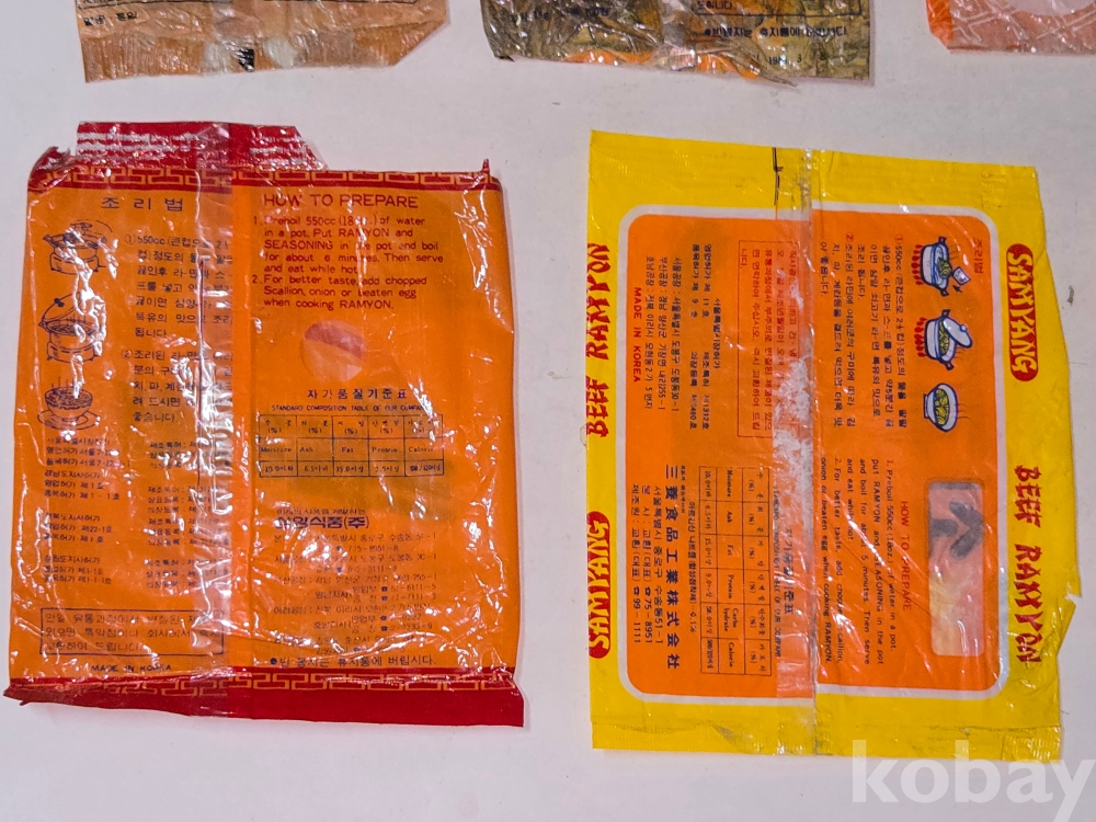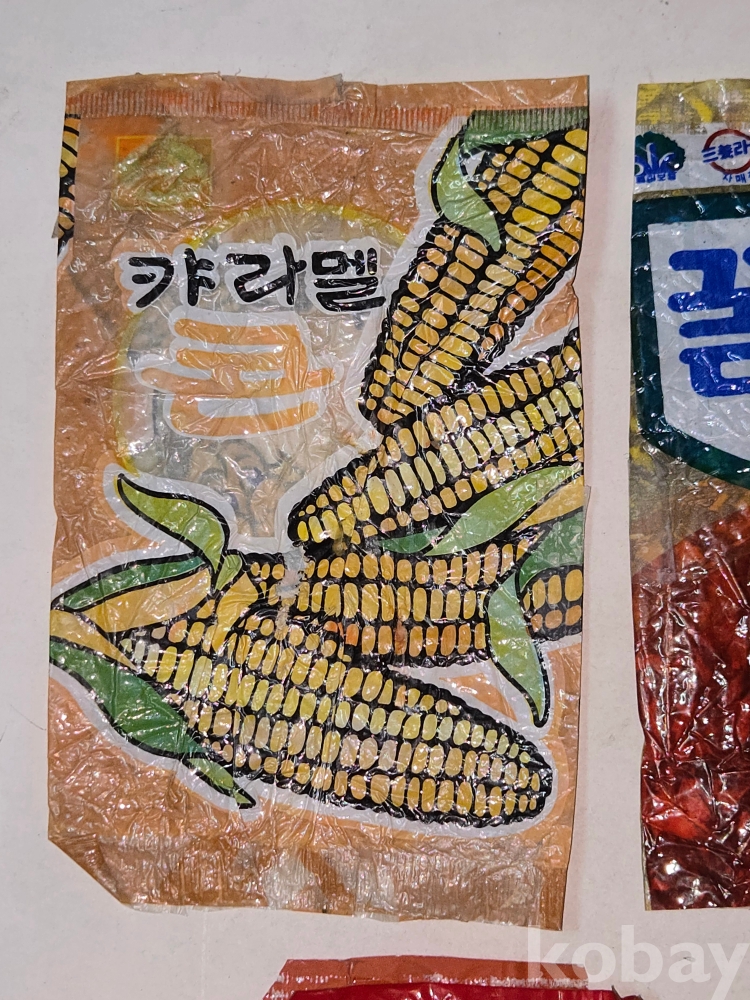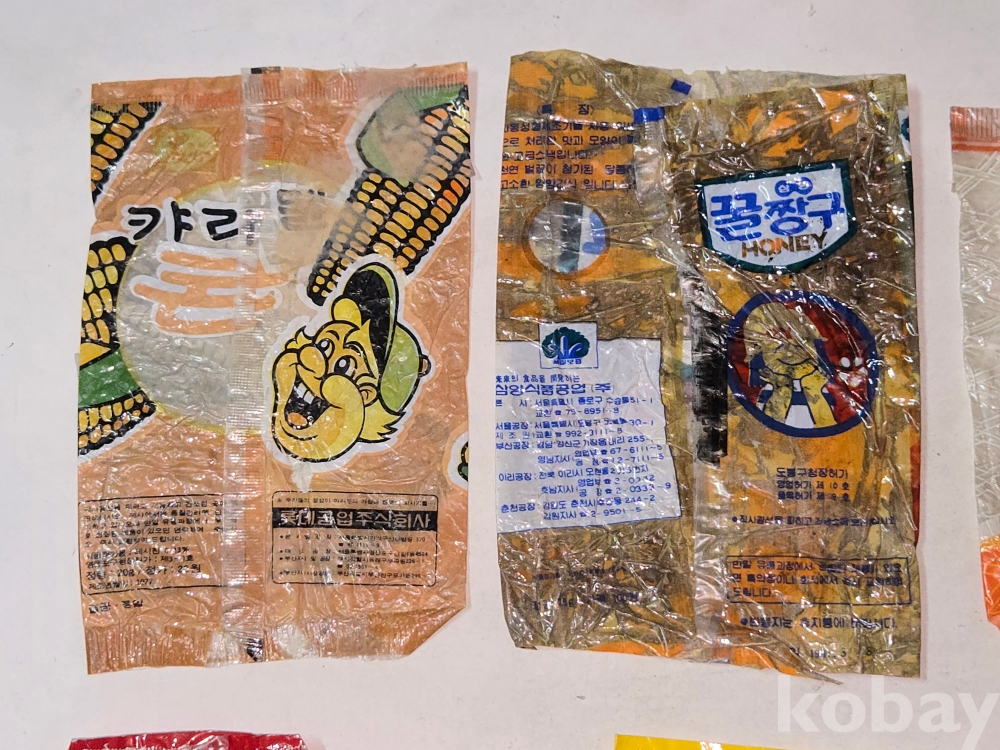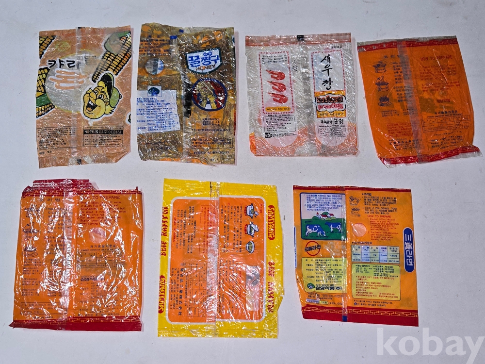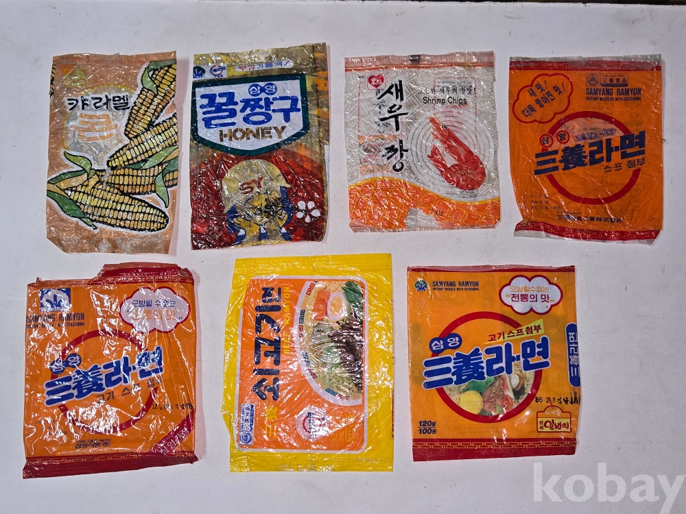 추억의 레트로 = 갸라멜.꿀짱구 .새우깡.삼양라면.쇠고기라면 등 각종다른 종류 7점 일괄 == 전시자료용