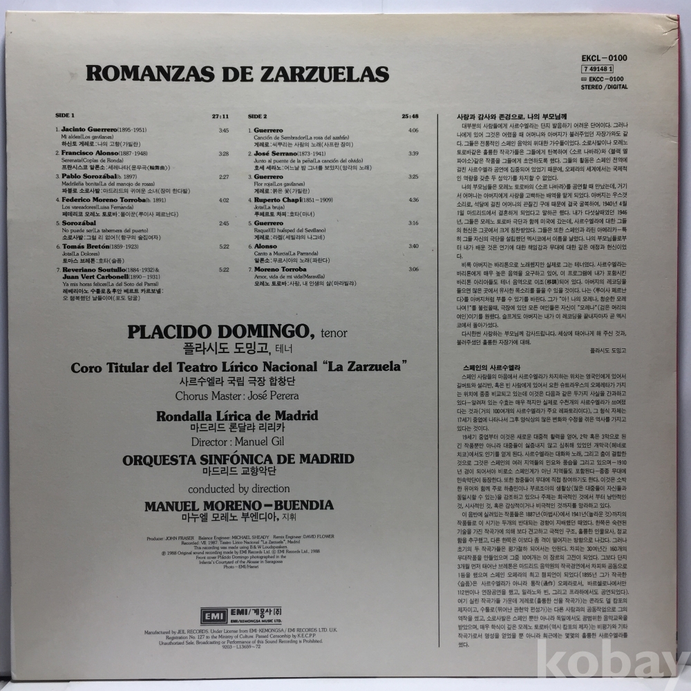 LP 81,300-44 Placido Domingo - Romanzas De Zarzuelas 자켓 EX+ 알판 NM 92 년 국내반