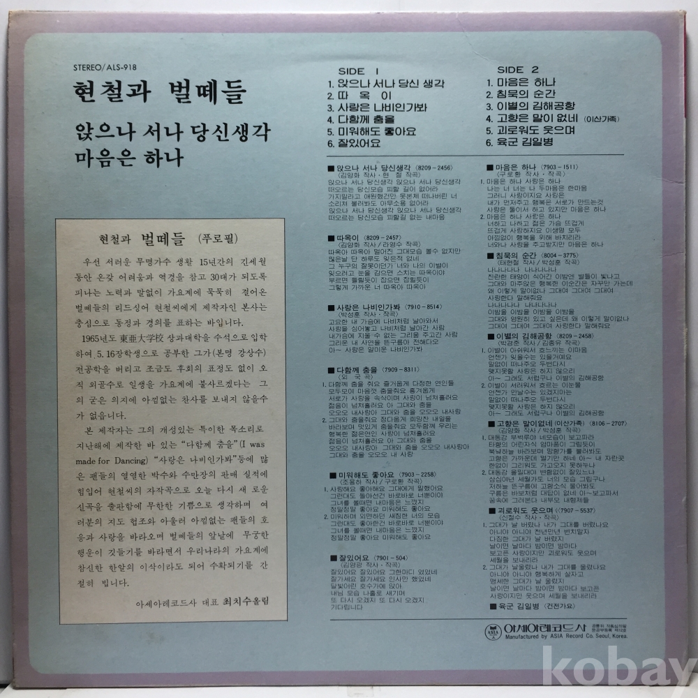 LP 82,400-100 현철과 벌떼들 - 앉으나 서나 당신 생각 자켓 EX+ 알판 EX 82 년 국내반