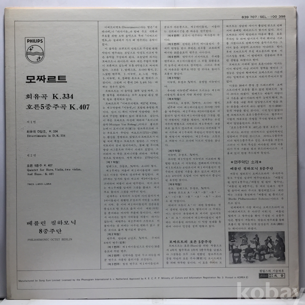 LP 82,400-85 모차르트 희유곡 K 334 호른5중주곡 K407 - 베를린 필하모닉 8중주단 자켓 EX+ 알판 NM 79 년 국내반