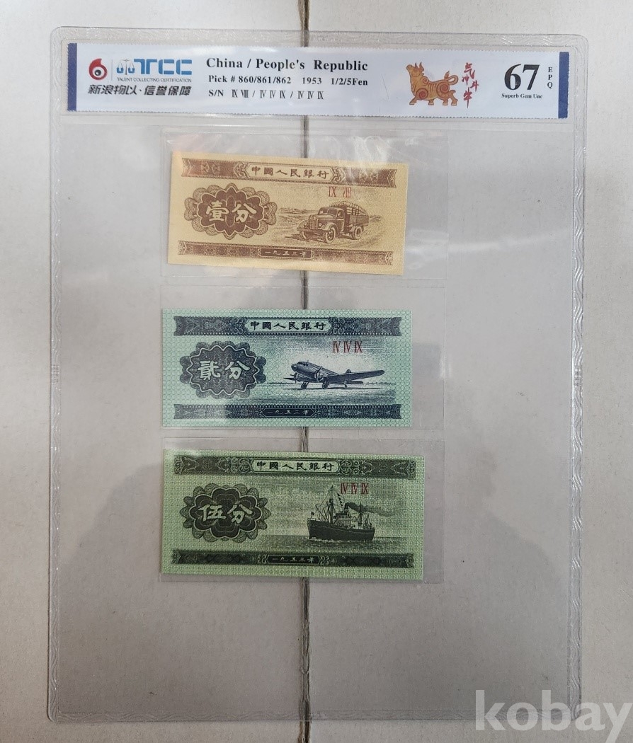 -1953년 중국 소액보조 분권 5, 2, 1분 3종 지폐 TCC67 고등급 입니다.