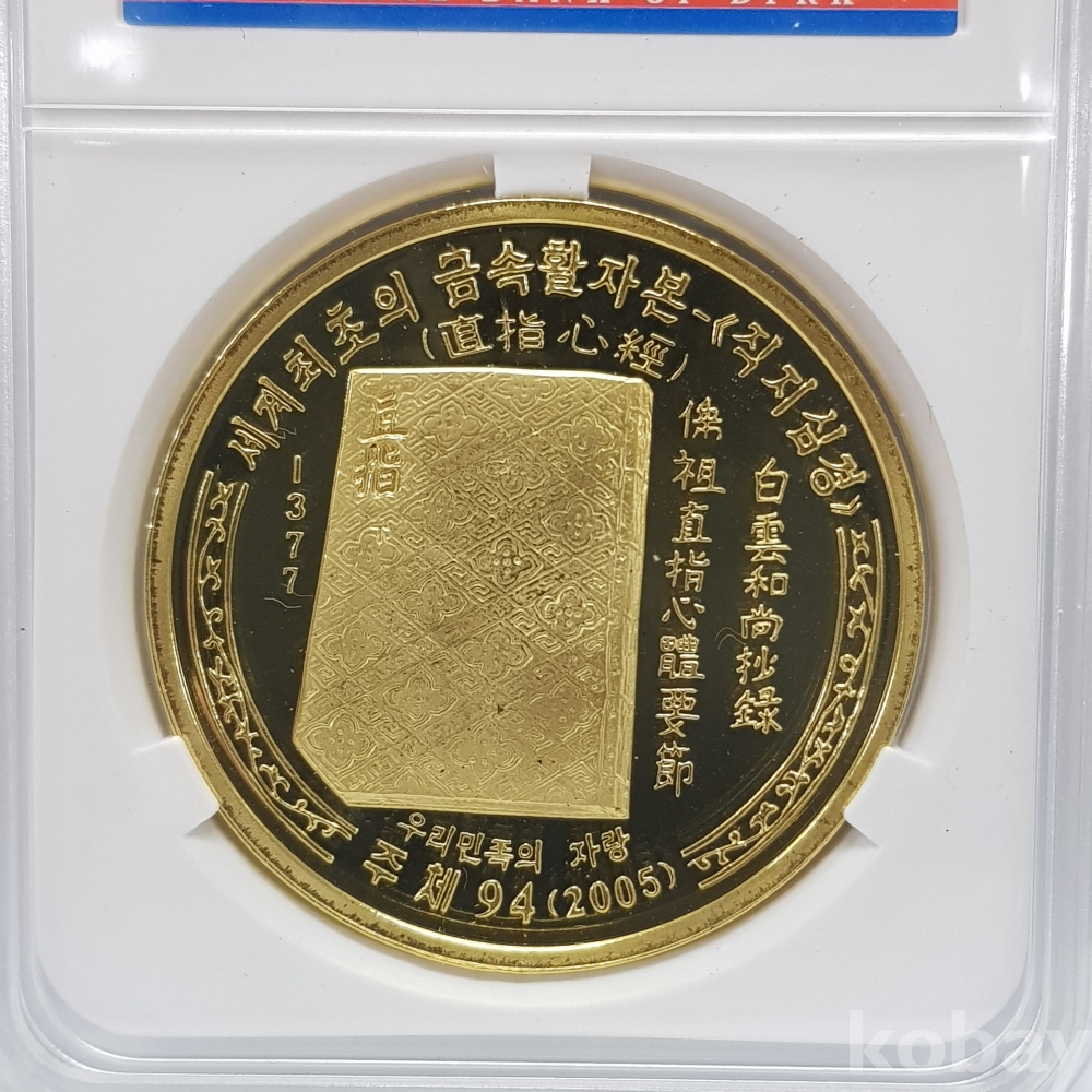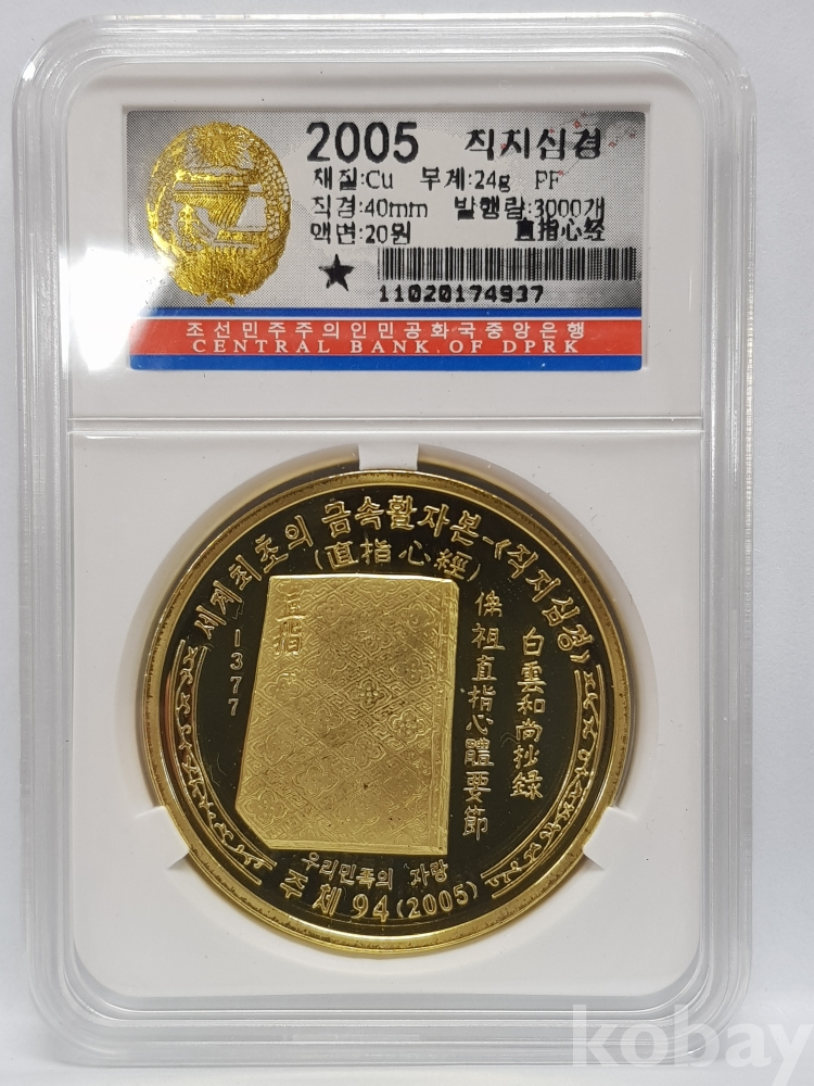 - 2005년(주체94) 직지심경 20원 프루프 인증 주화 - 세계 최초의 금속활자본 직지심경