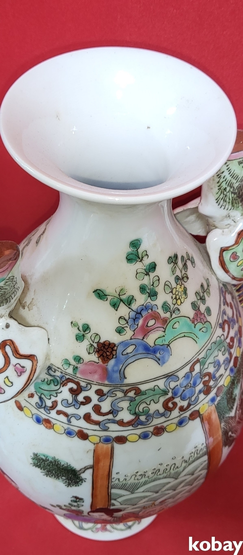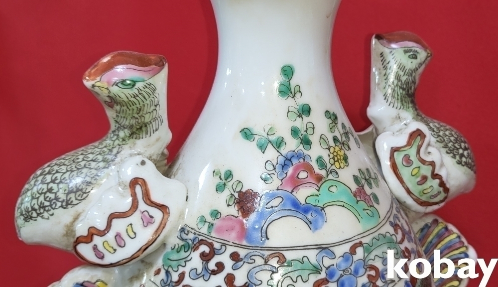 양쪽 상단에는 청상의 새로 알려진 극락조 (極樂鳥)가 뒤를 돌아보는 포즈로 크게 자리하고 있습니다, 쉽게 볼 수 없는 귀한 기물로 명품입니다,