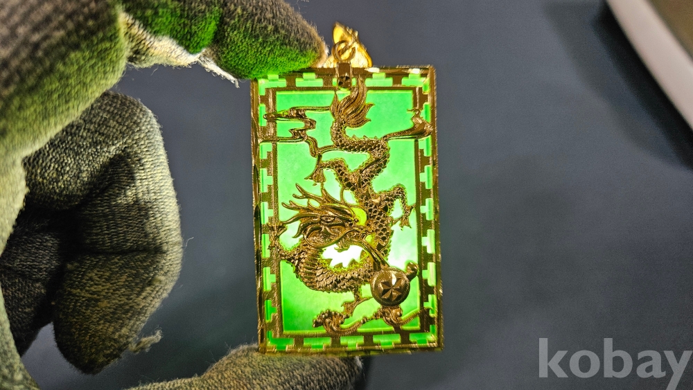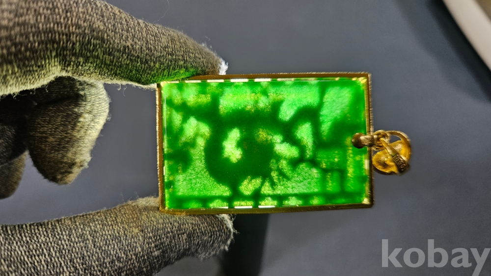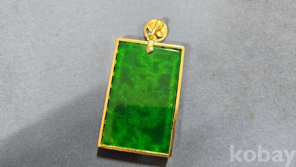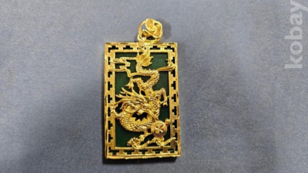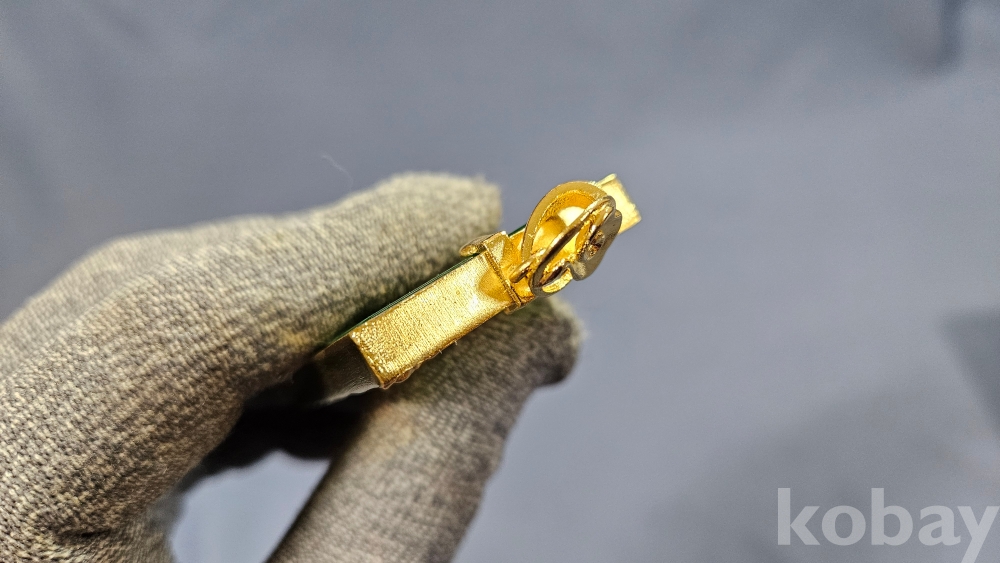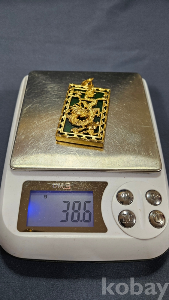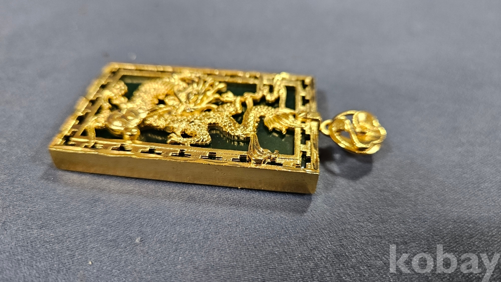 용 문양 장식으로 되어있으며, 초록색 부분은 옥으로 보입니다.