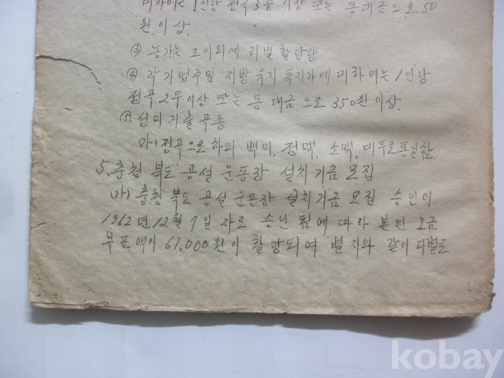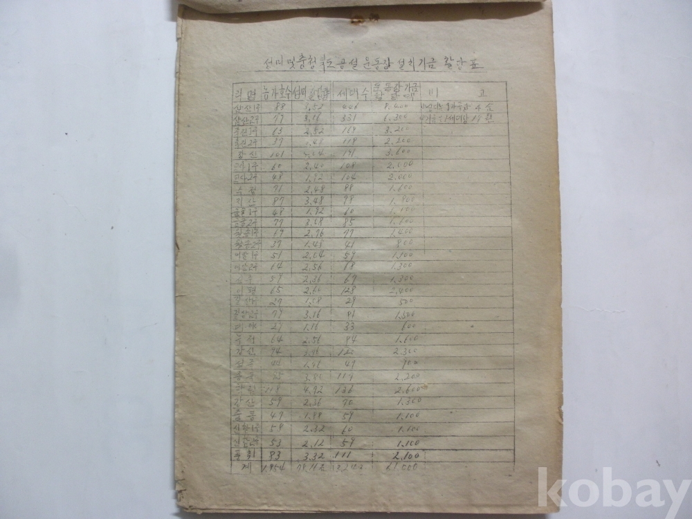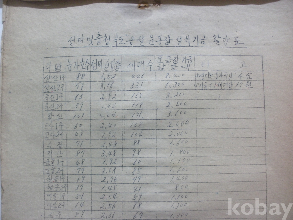 리장 회의서류 - 충청북도 공설운동장 설치기금 할당표 등 다양한 업무내용 (1963년, 보은)