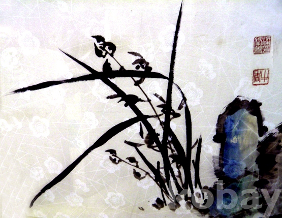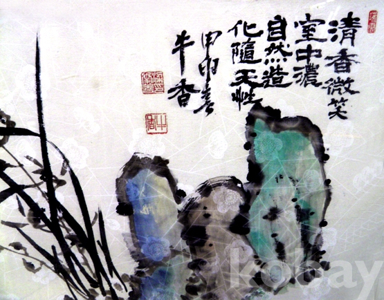 90x65x5cm,3개의 우향 낙관이 예사롭지 않은 난초와 3개의 못난이바위/장식달린 유리액자