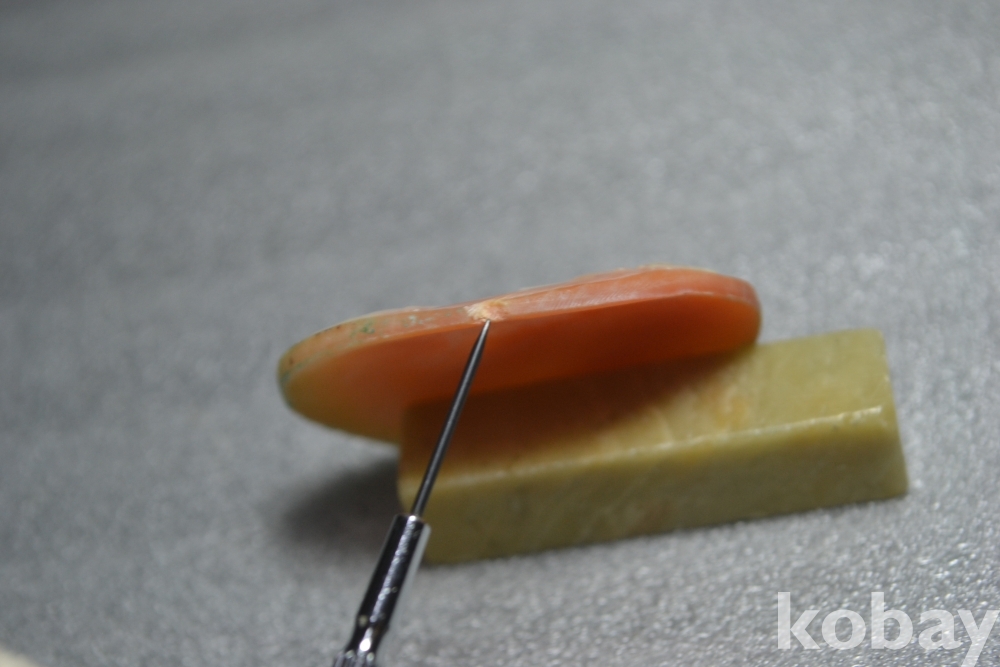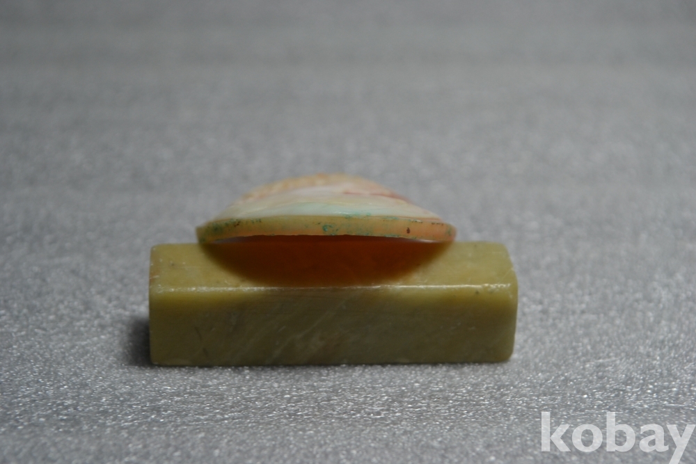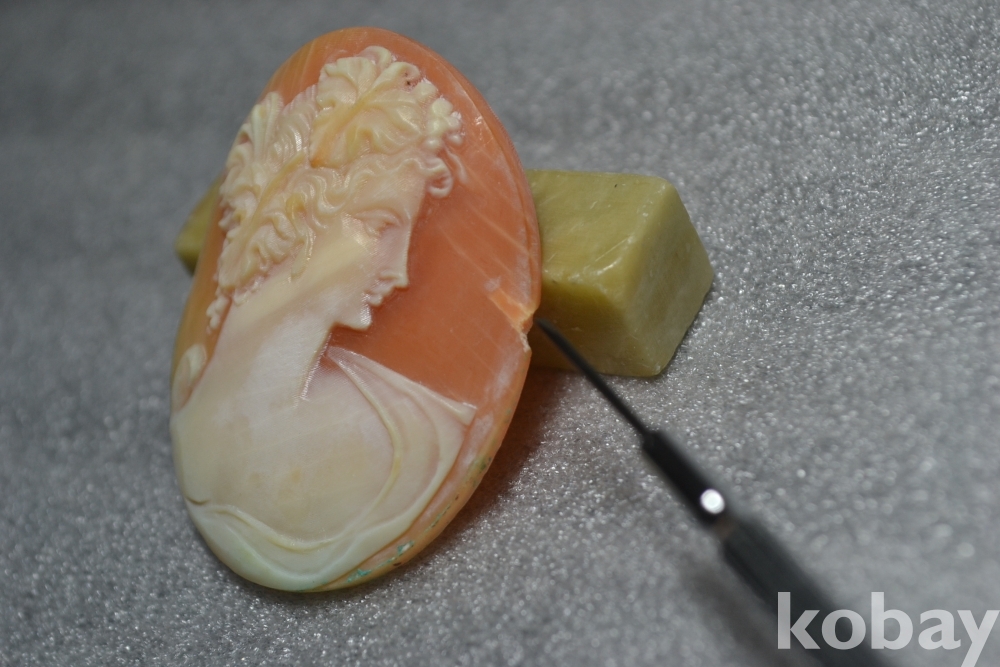 ** 까메오 작품의 측면부 테두리 부분(3시방향)을 보시면 작은 튐상처가 1곳 있습니다. (검은핀으로 가르킨 부분 4번째, 5번째 사진참조)