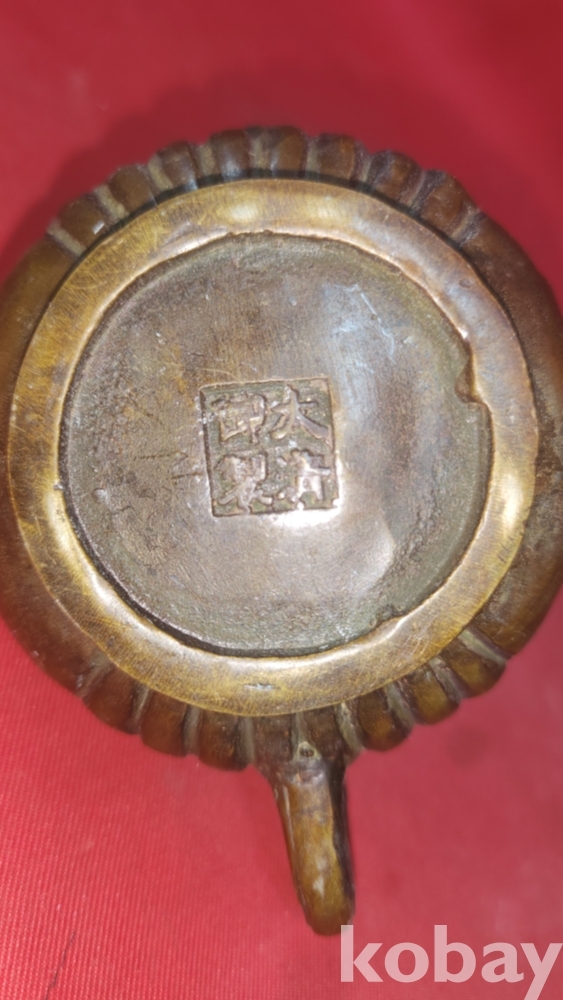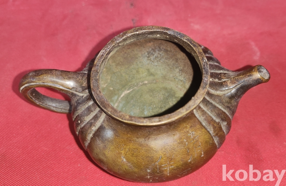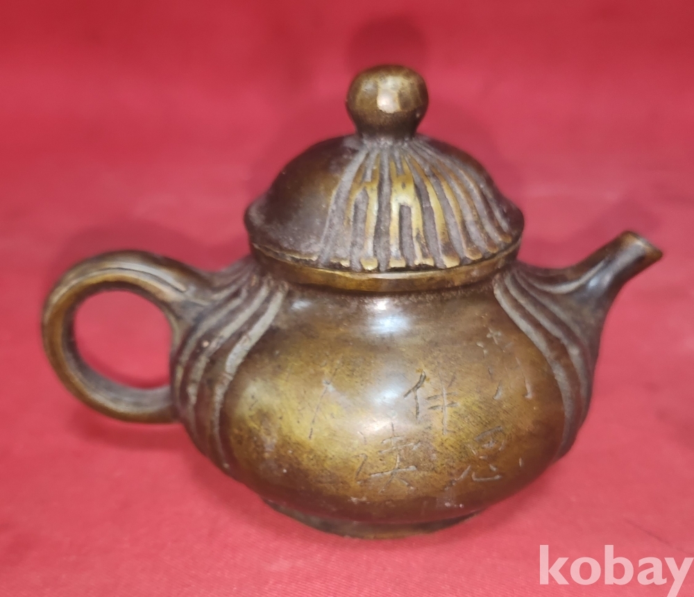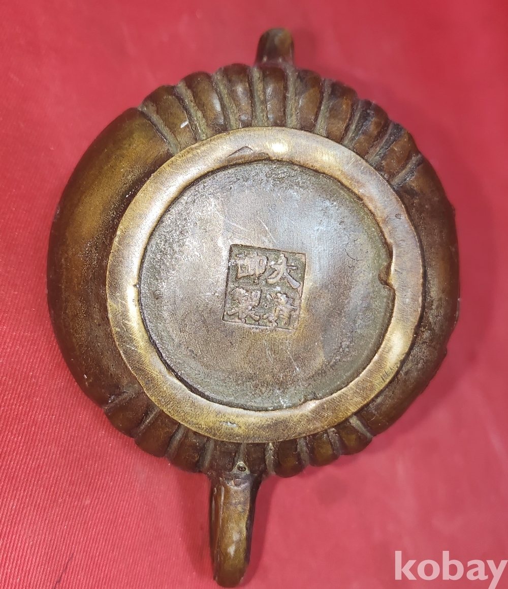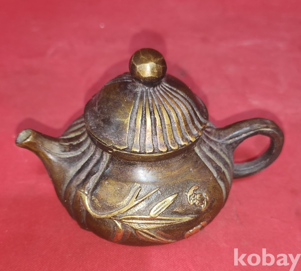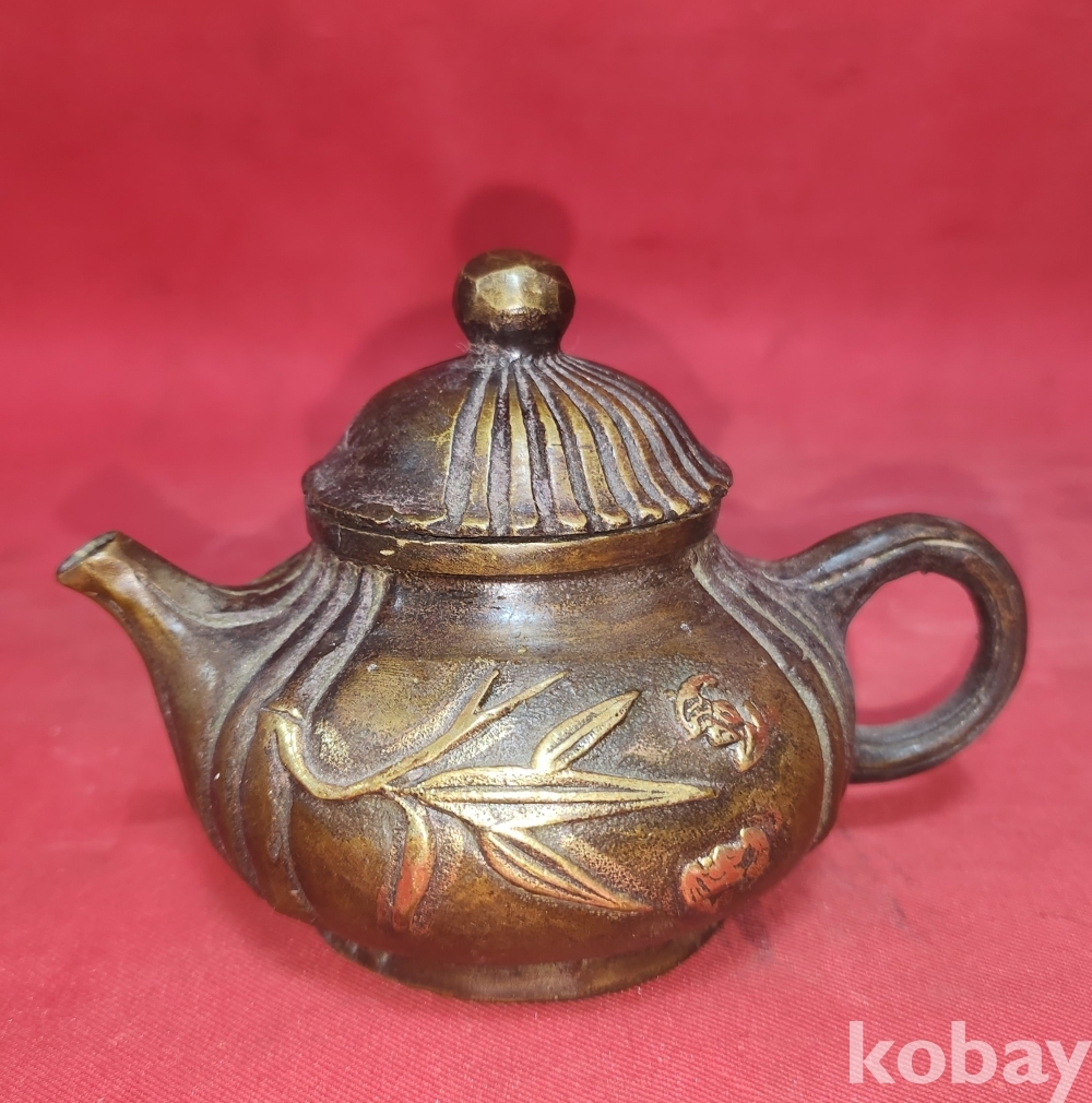 대청어제(大靑御製) 관지 보이는 적동으로 완성된 대잎(竹葉)과 쌍박쥐 문양 주전자입니다,