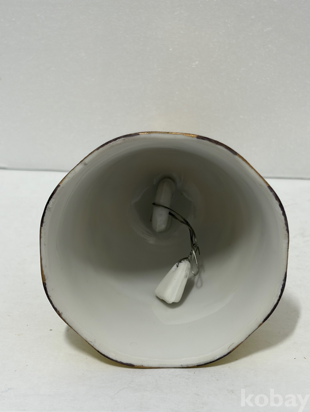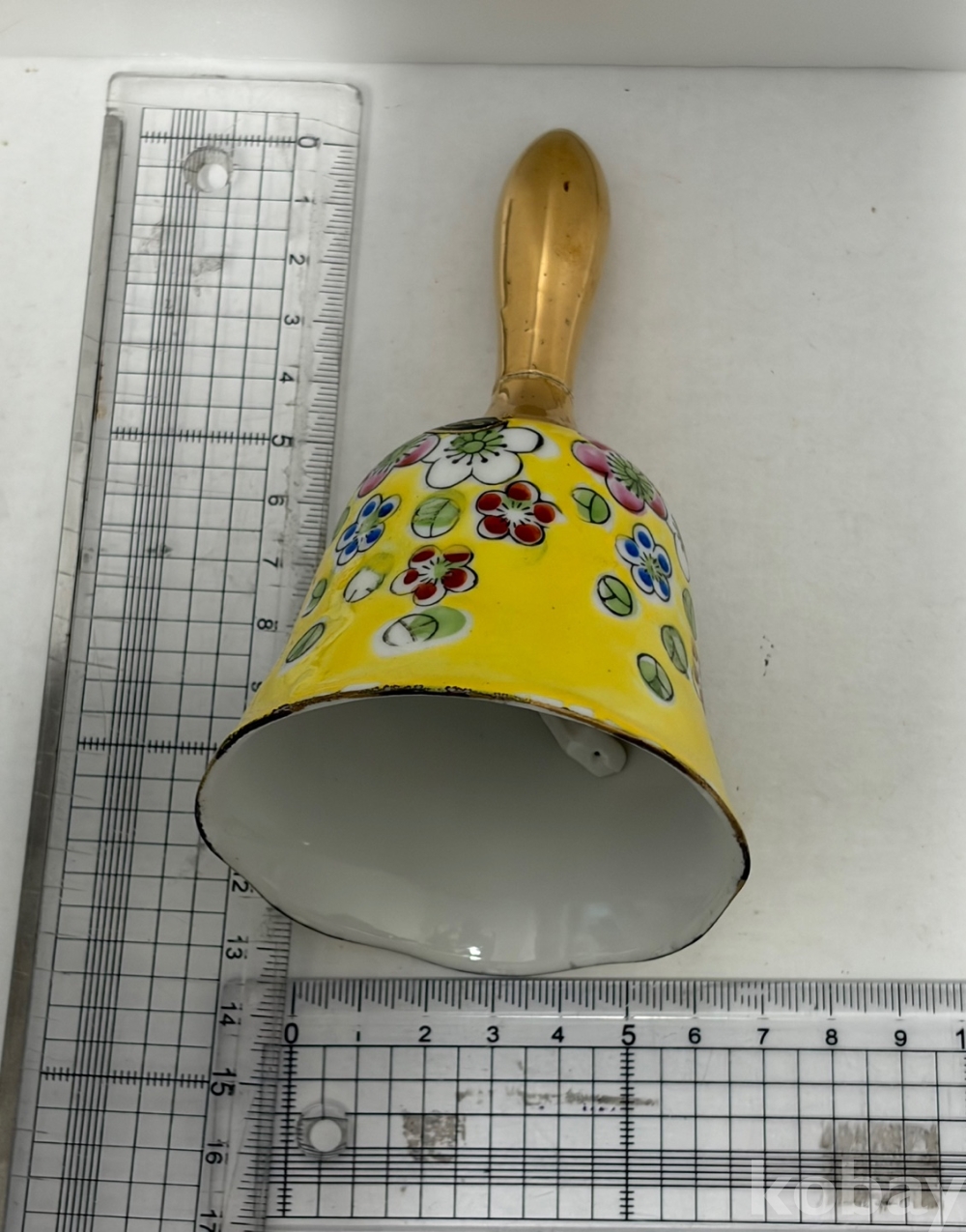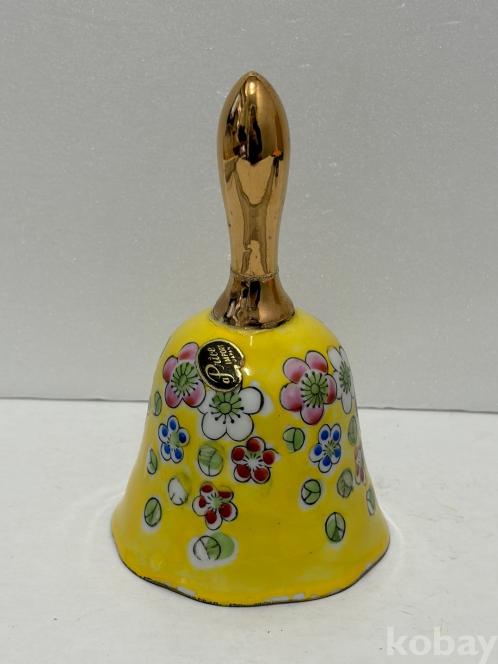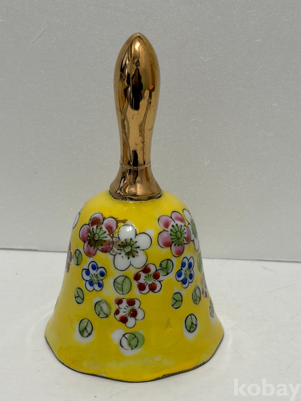 꽃무늬가 있는 노란색 도자기 종입니다.