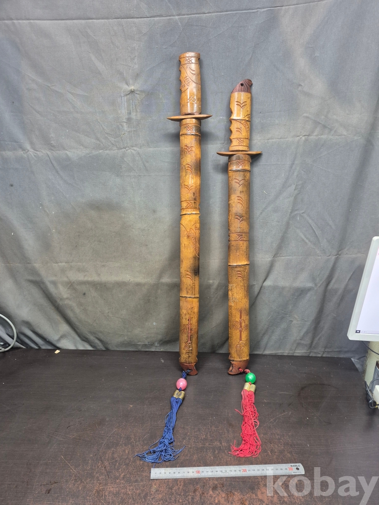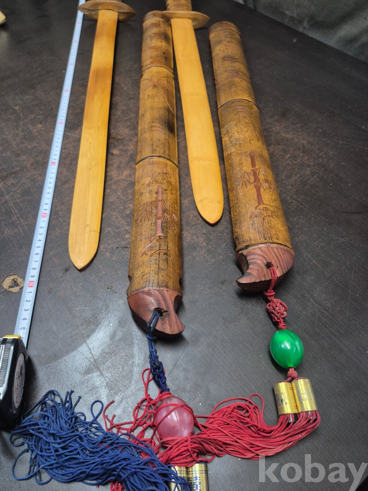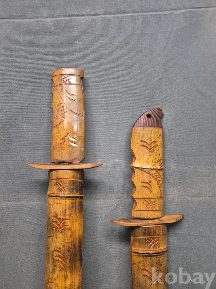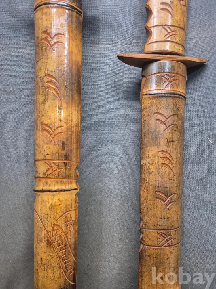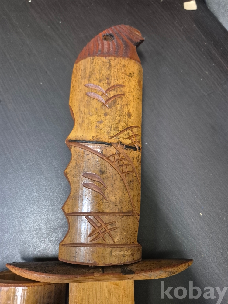 1970년대 대나무를 핸드매이드로 깍아 만든 목검 칼과 칼집 2점 일괄 모두 손으로 깍아 만들엇습니다 장식순에 복자가 새겨져 있어요 장식용으로 사용햇던것으로 추정합니다