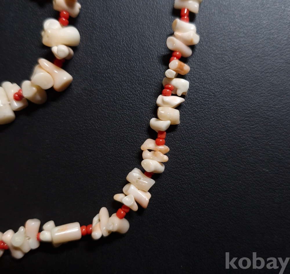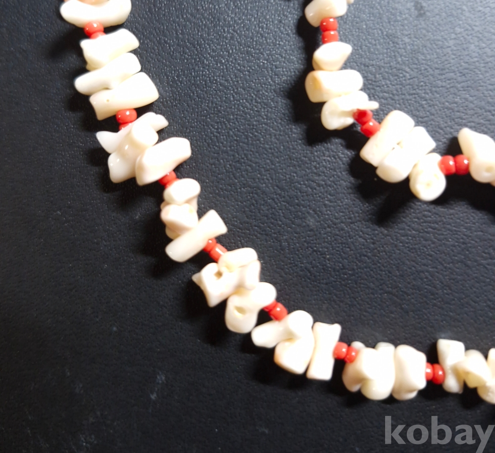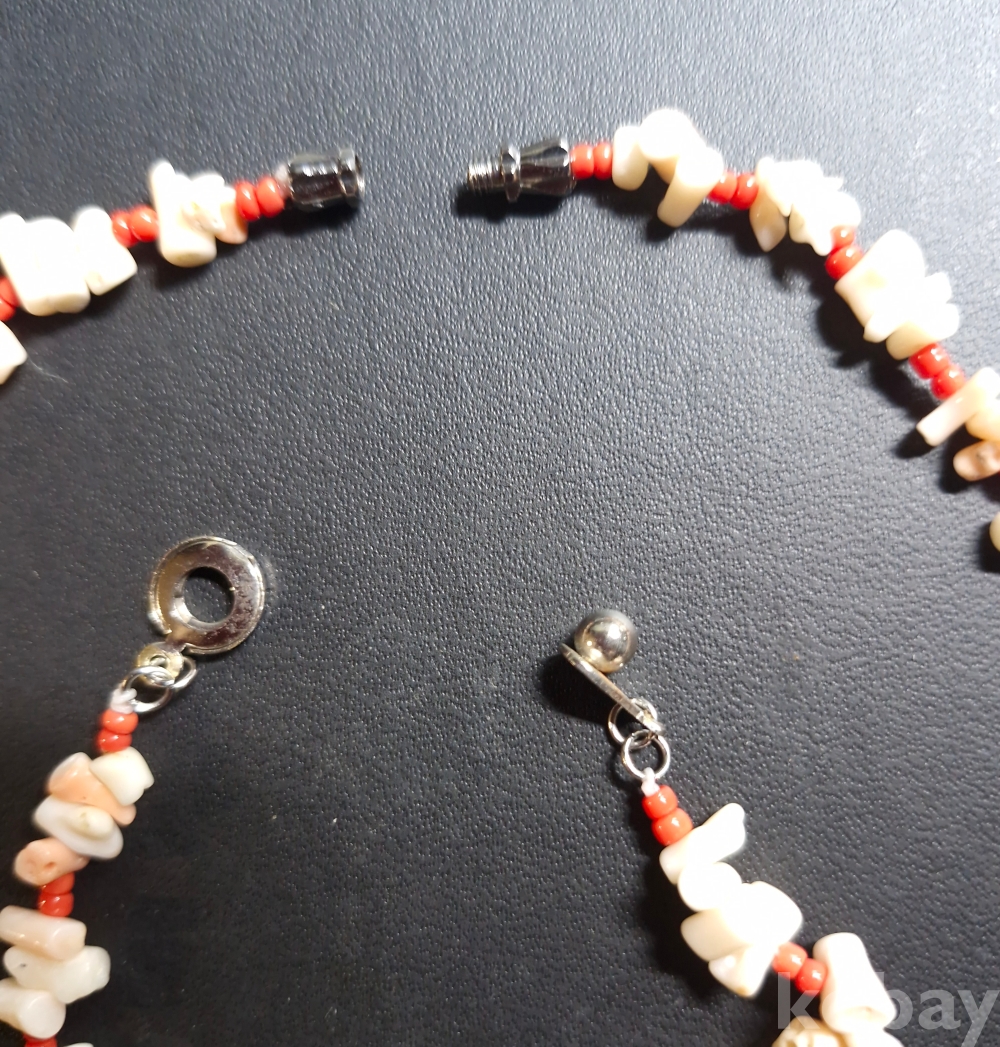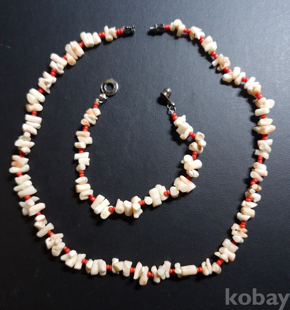 분홍색 산호칩과 주홍색 산호구슬로 만든 목걸이 팔찌입니다. 나사식과 똑딱이 형태의 채움장식입니다.
