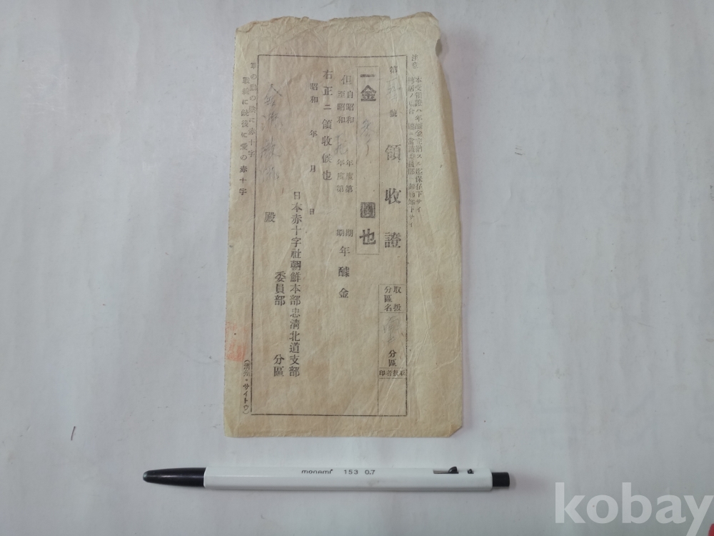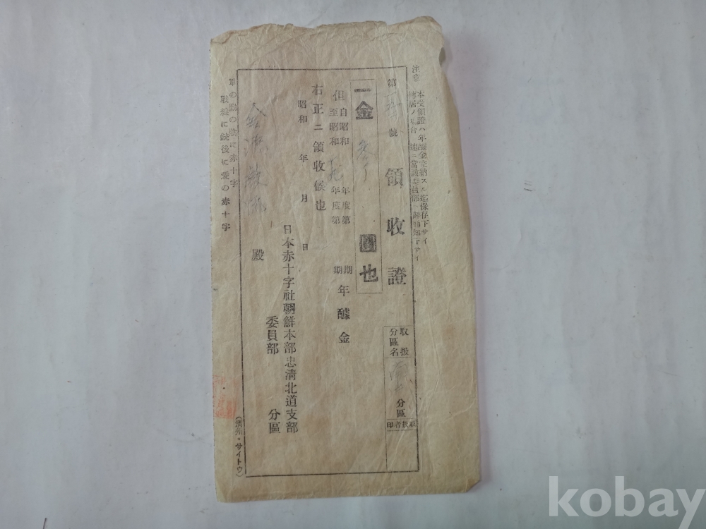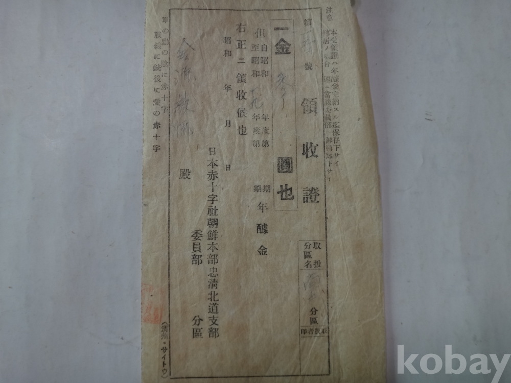 일본적십자사 조선본부 충청북도지부 - 갹금 (醵金) 영수증 (소화19년)