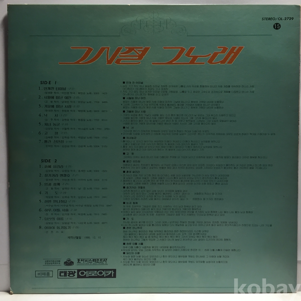 LP 250-185 그시절 그노래 15집 - 최안순 이수미 방은미 바니걸즈 외 86 오아시스 자켓 EX+ 알판 EX+