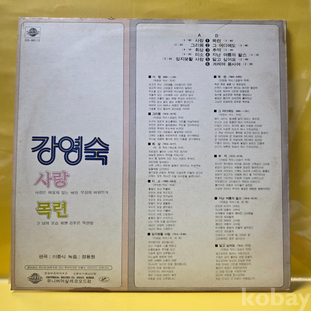 | 자켓상태 | EX : 약간의 마모, 모서리 찢김 존재 | 음반상태 | NM : 개봉했으나 미사용급, 스크래치 없음 | 발매정보 | 초반 | 가사지여부 | 무 |