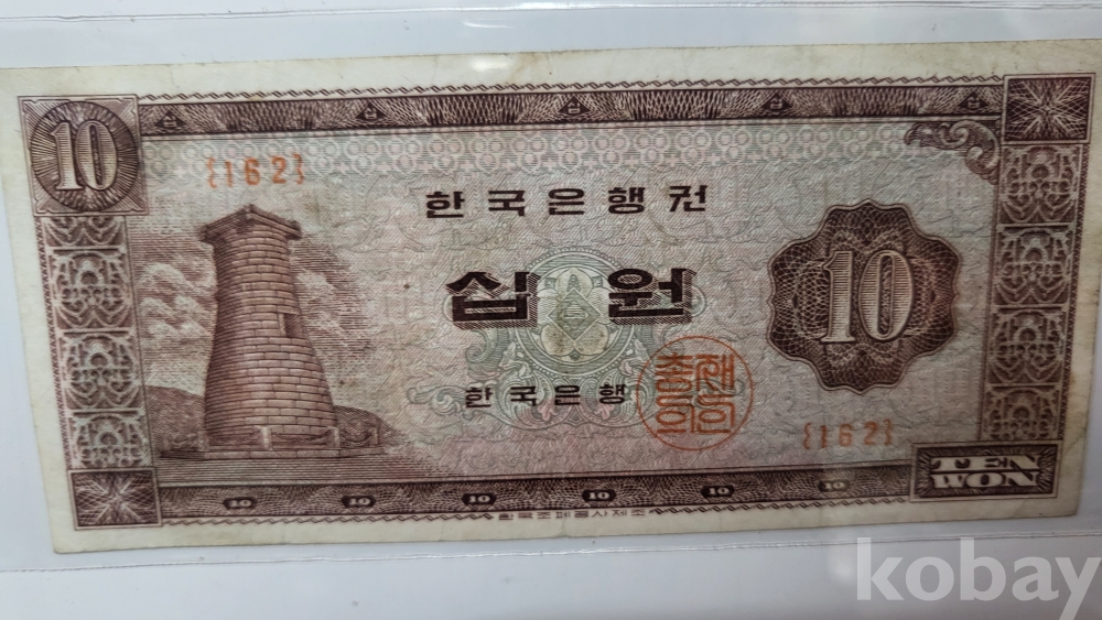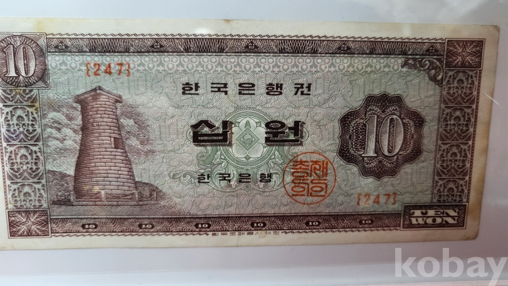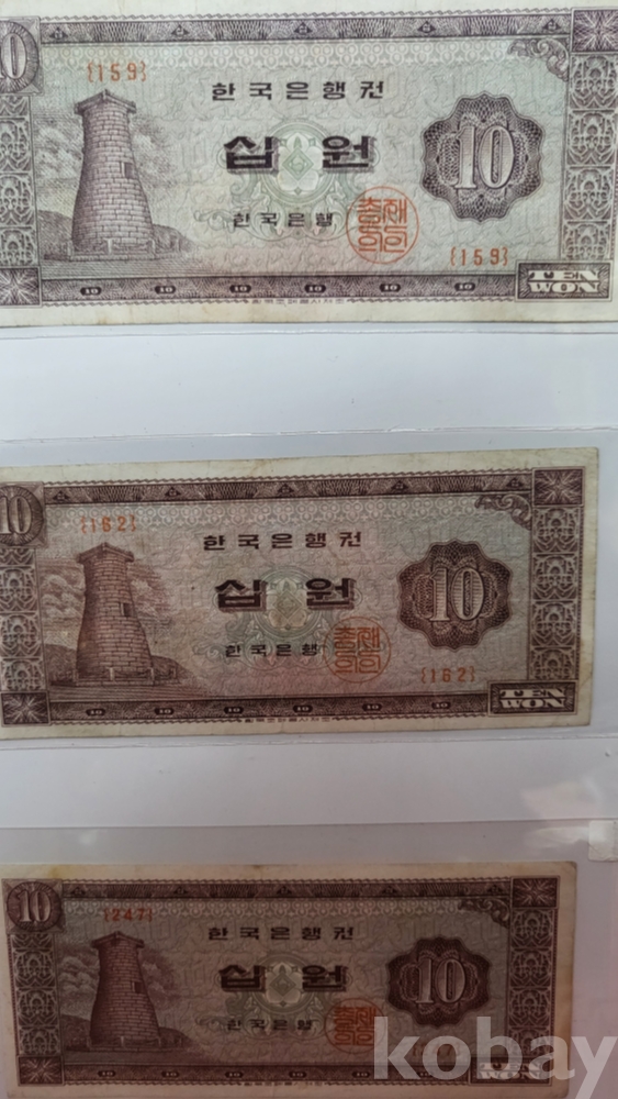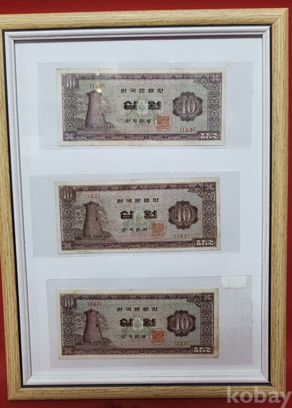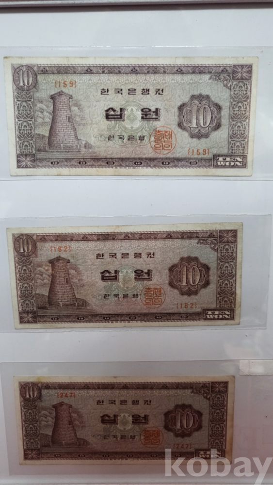 1950년대 발행된 십원 지폐 3장이 들어있는 액자입니다,