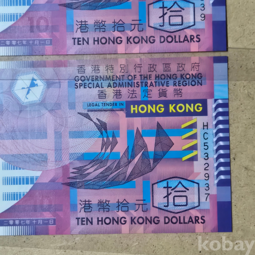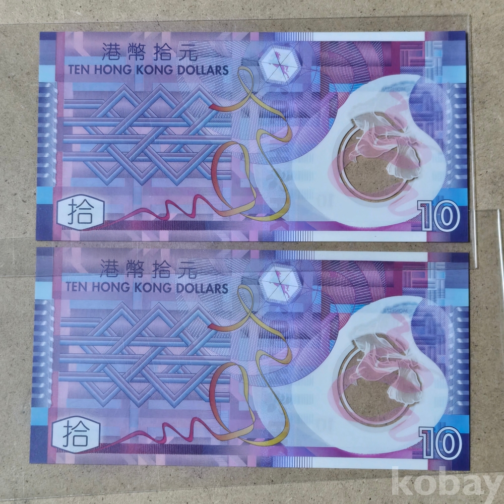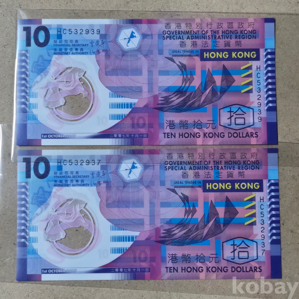 홍콩 2007년 10달러 플라스틱 폴리머 미사용 지폐 이어지는 연번호 2매 일괄