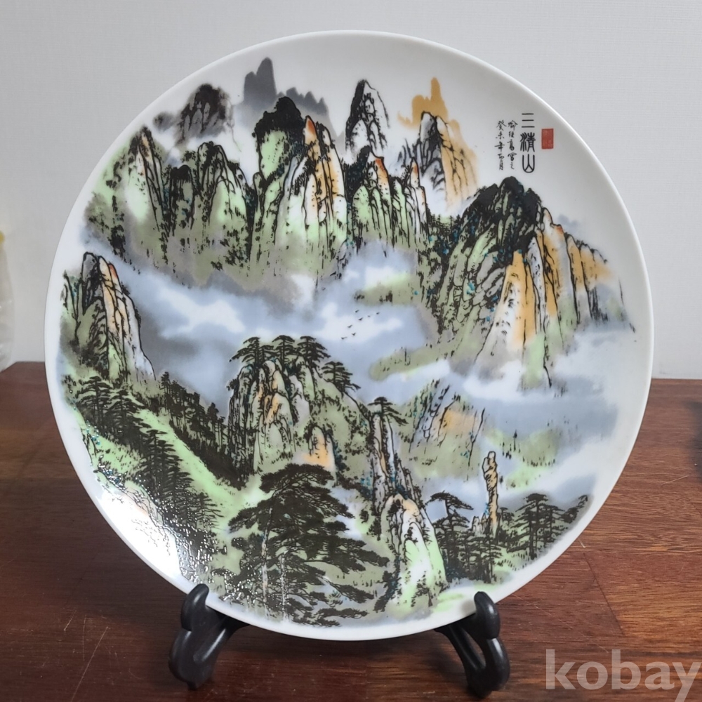그림이 화려하게 전사된 도자기 접시입니다. 미사용 작품으로 좌대와 함께 제공되며 사이즈와 무게 모두 장식용으로 두고 보시기에 손색없는 작품입니다