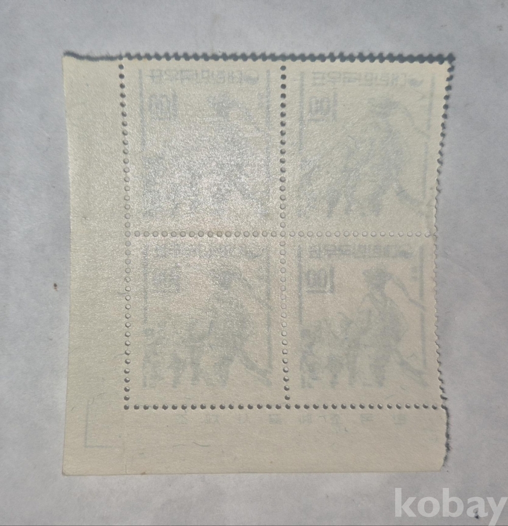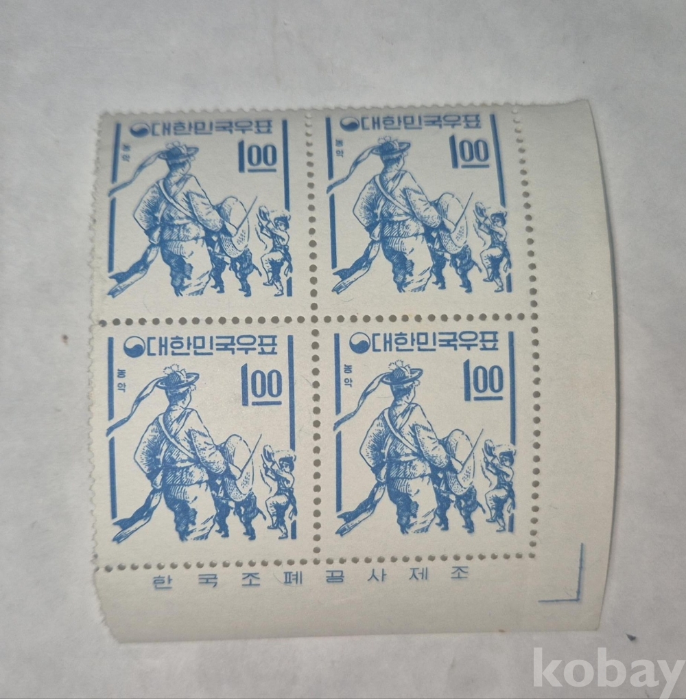 1960년대 발행된 농악 보통우표 1원 4매 명판부 블록입니다.