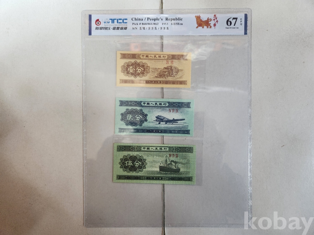 -1953년 중국 소액보조 분권 5, 2, 1분 3종 지폐 TCC67 고등급 입니다.
