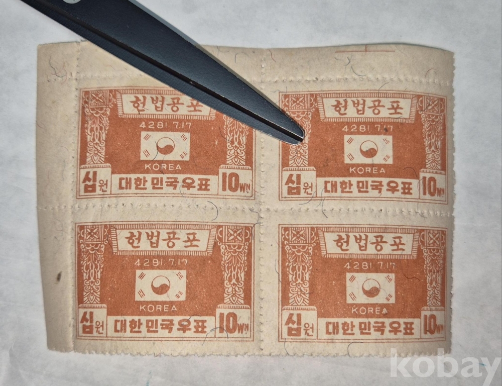 1948년 발행된 '대한민국 헌법공포 기념우표' 태극기 10원 4매 변지부 블럭 입니다.