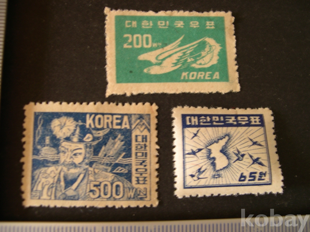 보통, 3종 #121929 : 200원 제비와 지구 + 500원 이순신장군 + 65원 까치와 지도