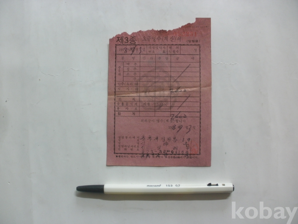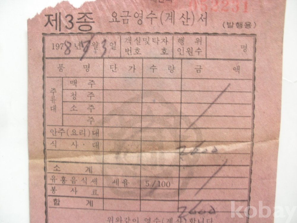 제3종 (유흥음식세, 5/100) 요금 영수서 (1978년, 충주시 성남동)
