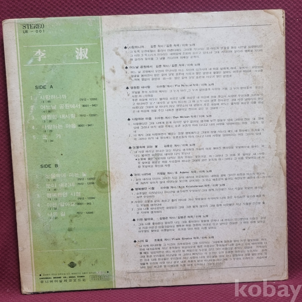 | 자켓상태 | EX : 약간의 마모, 모서리 찢김 존재 | 음반상태 | NM : 개봉했으나 미사용급, 스크래치 없음 | 발매정보 | 초반 | 가사지여부 | 무 |