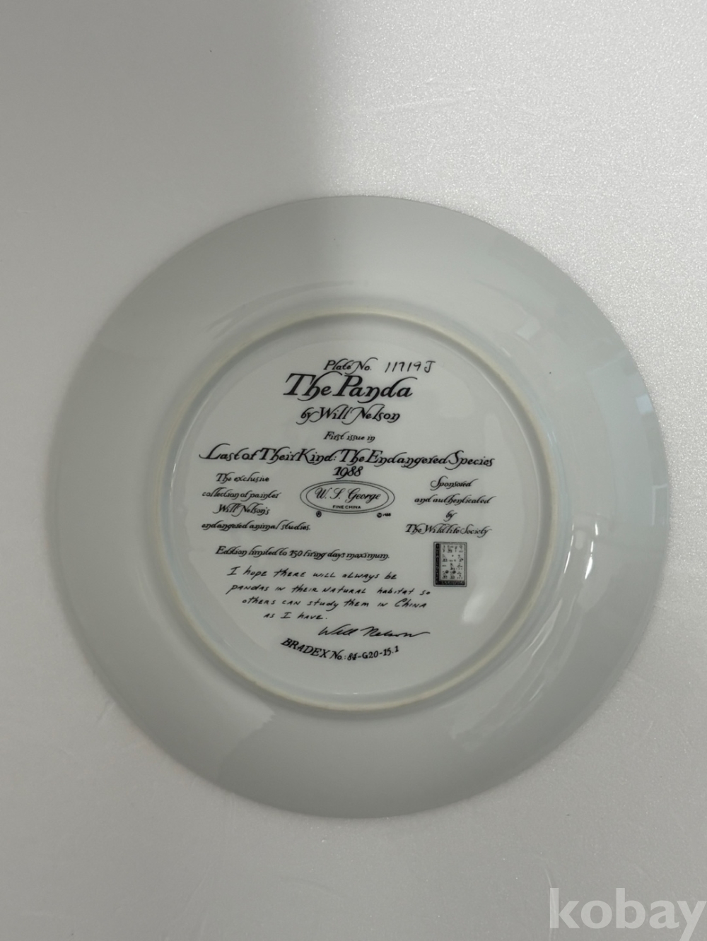 1988년 W.S. George에서 제작한 Will Nelson의 1988년작 The Panda 접시입니다.