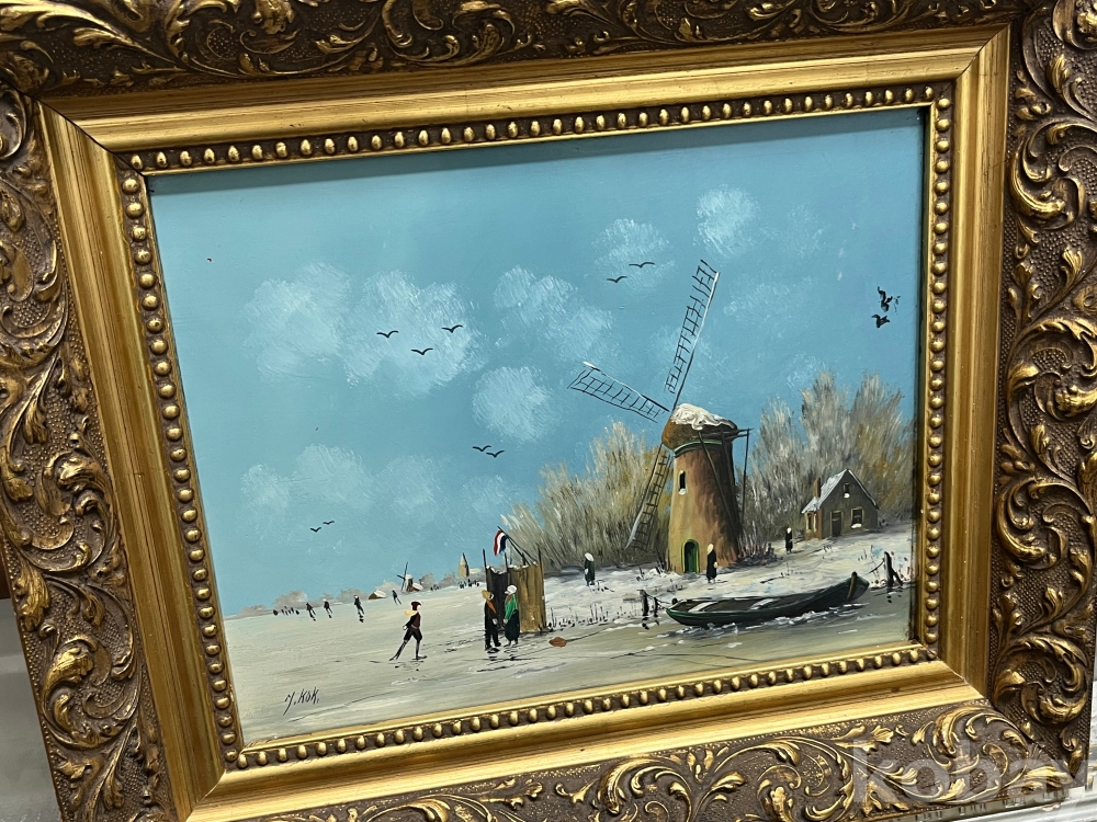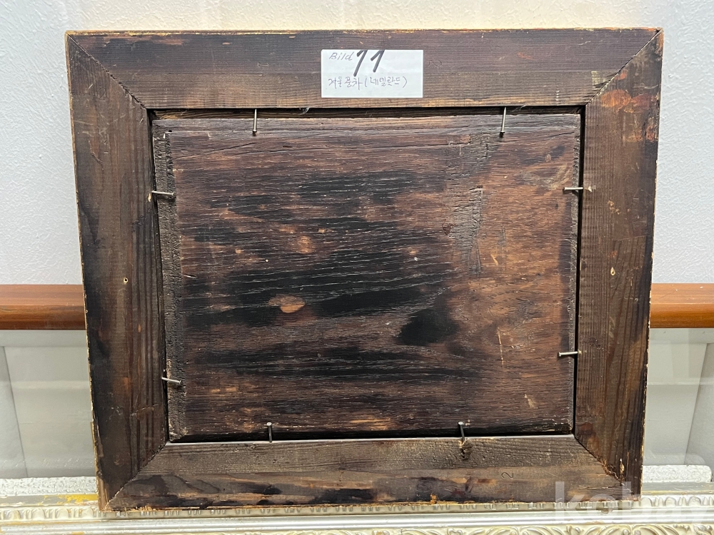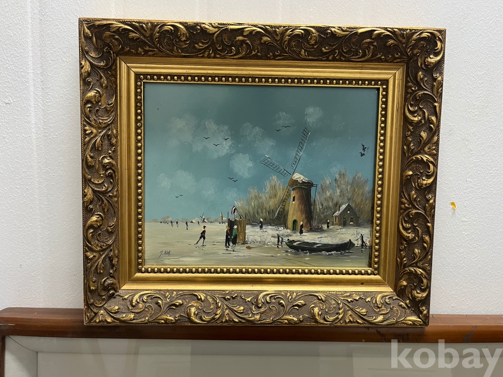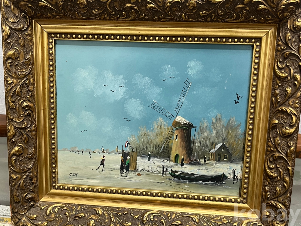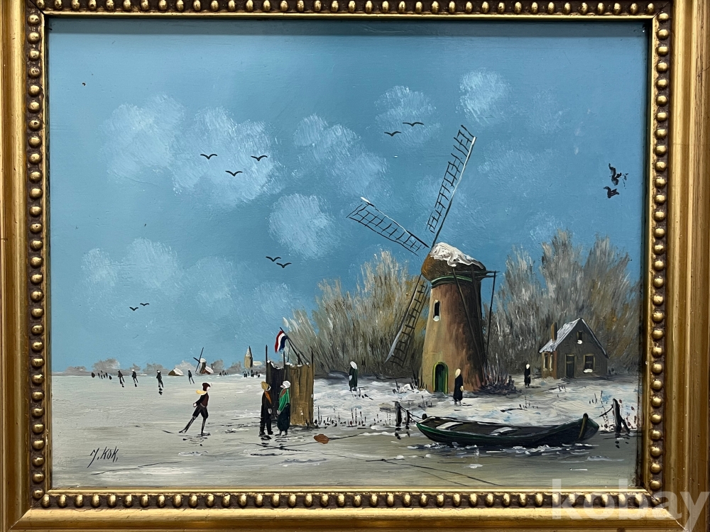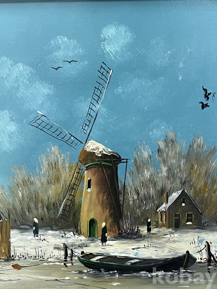 눈덮인 겨울 들판을 배경으로 풍차와 얼어붙은 수면위를 오가는 사람들의 모습을 담은 풍경화입니다.