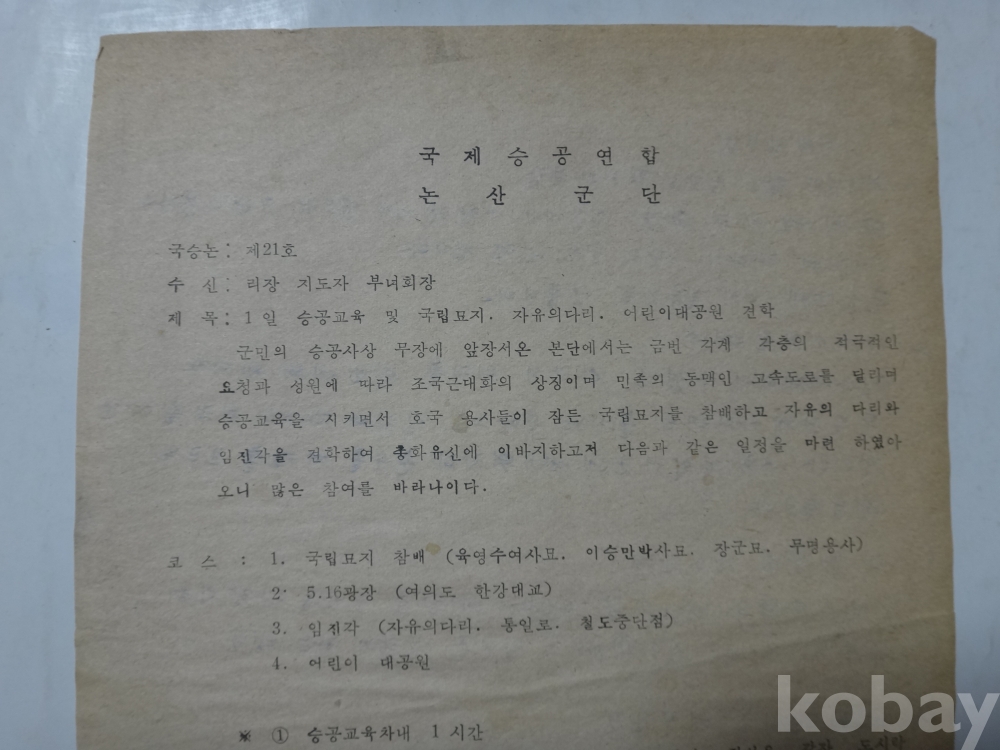 국제승공연합 논산군단 - 견학 안내 (국립묘지(육영수 묘등) 참배 등, (뒷면) 타락성 본성 1975년)
