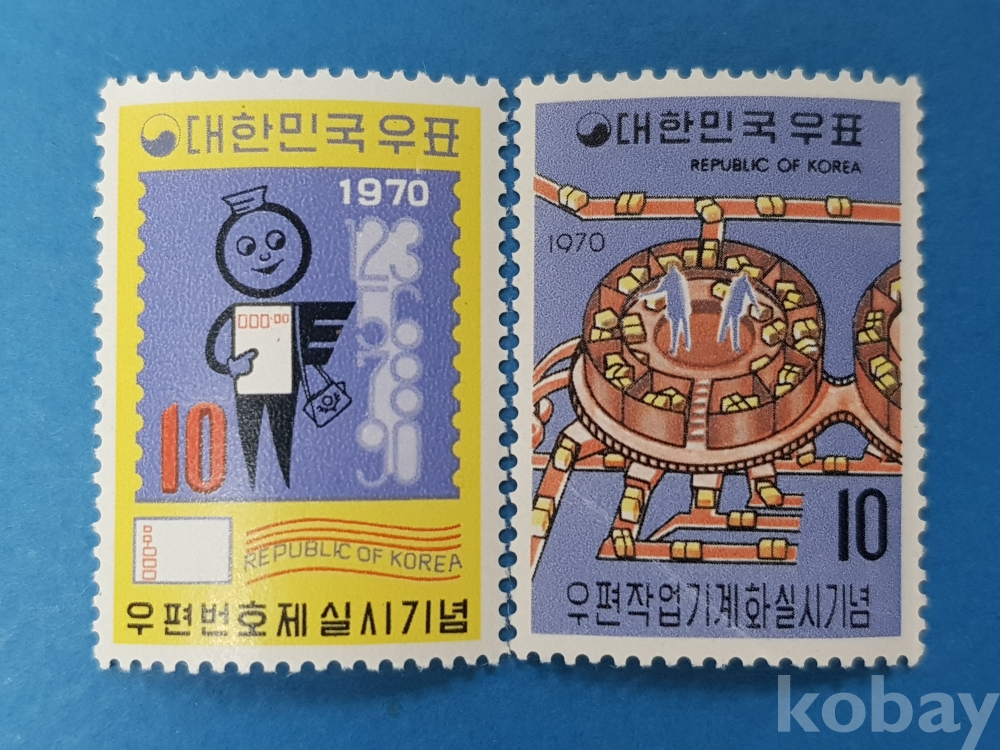 **** 우편작업기계화실시기념, 우편번호제실시기념/1970/대한민국 우표/1장 후면 연필글씨있음