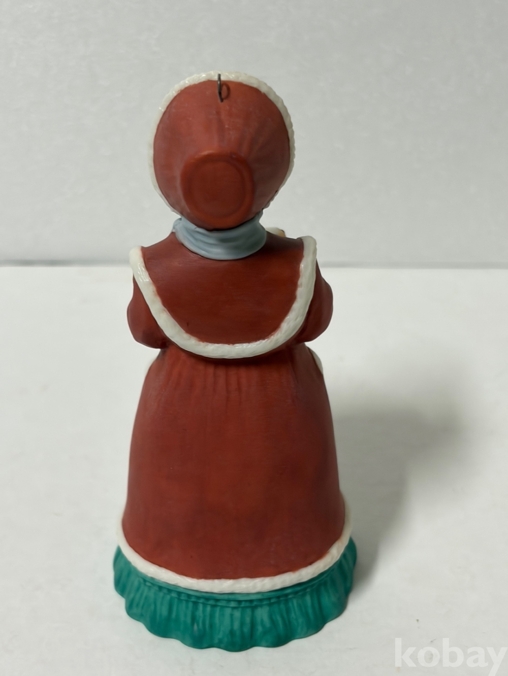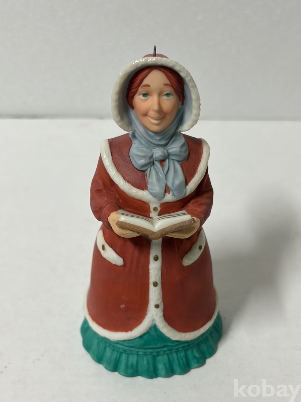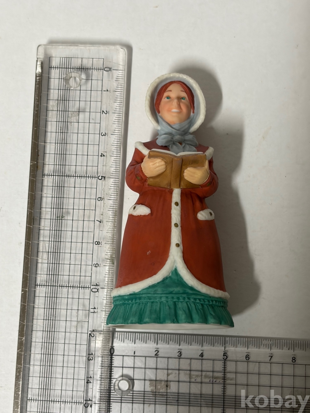 빅토리아 시대 스타일 의상을 입고 찬송가 책을 들고 있는 모습의 도자기 종입니다.