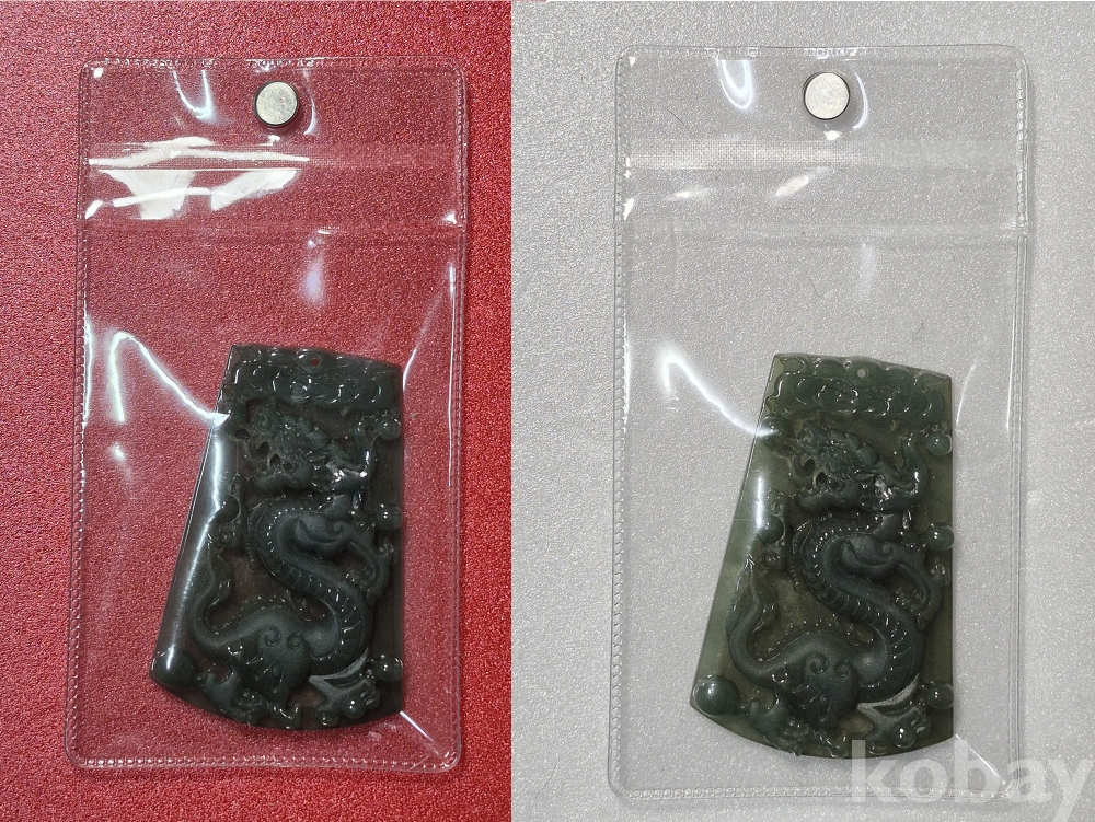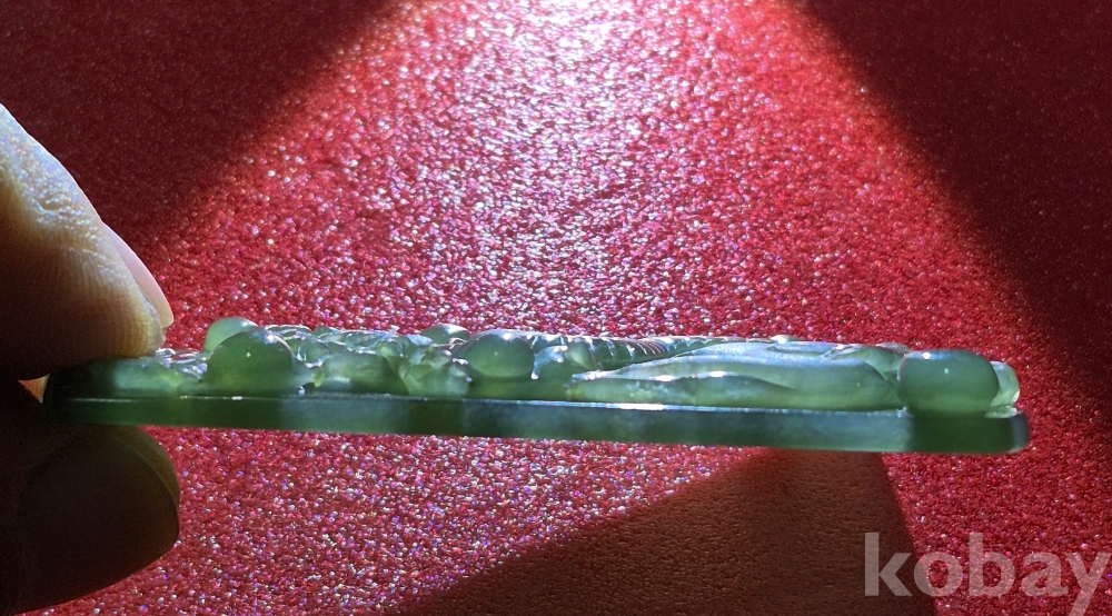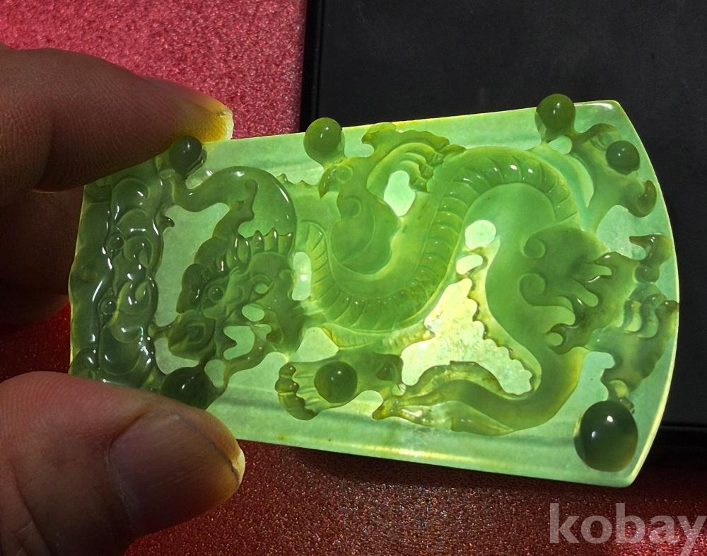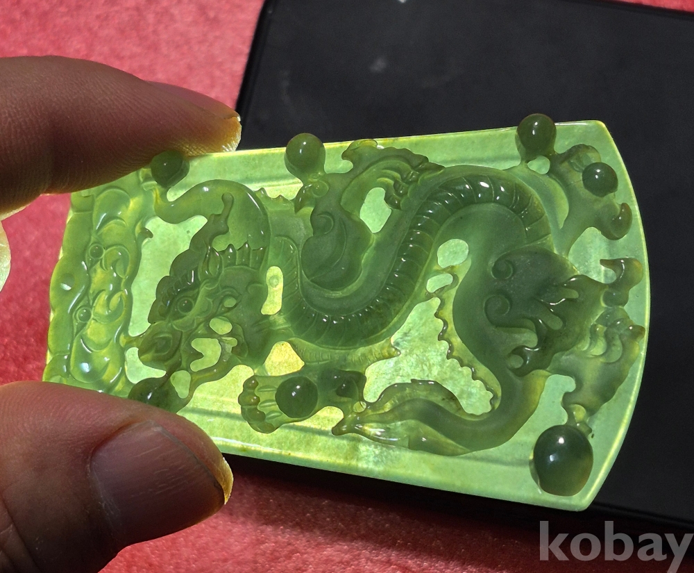 비취는 비취청색을 최고로 치지만, 이 용패는 밝은 빛을 비추면 비취색이 보입니다만 겉으로는 그레이 색이며, 이런 고귀한 그레이색도 매우 귀하게 대접받고 있으며, 170캐럿이 넘는 이정도 크기와 조각은 중국에서 적어도 100만원은 줘야 손에 넣을 수 있습니다.
