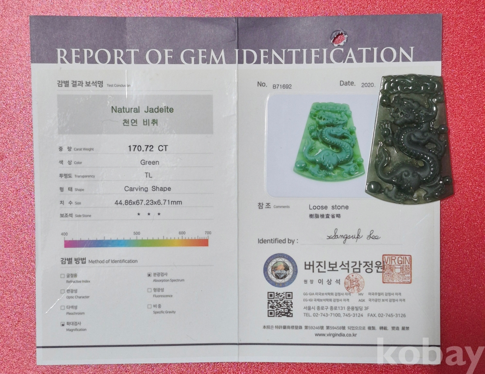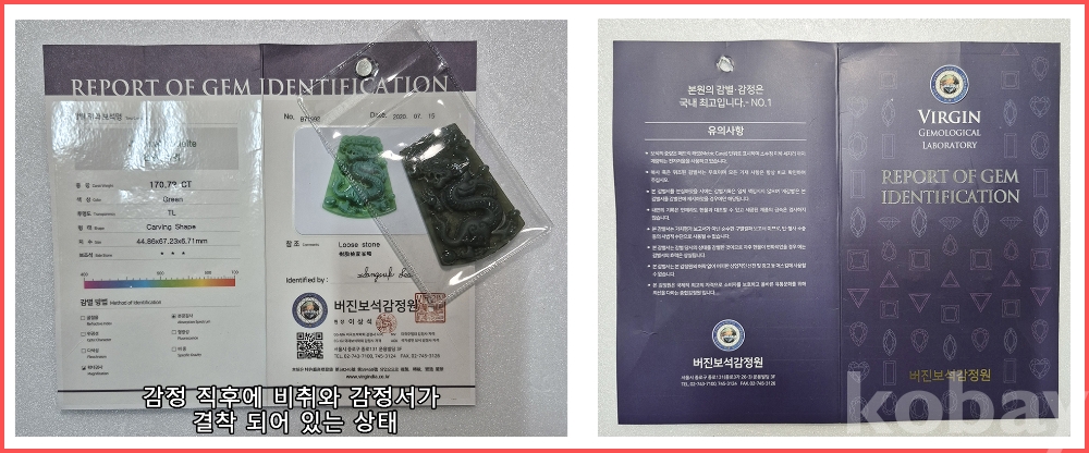 종로3가에 있는 버진보석감정원에서 2020년 7월에 감정 받은 것으로 100% 천연비취 진품 입니다. 감정 받은 후에 보석이 감정서에 잡아 매어져 있던 것을 사진을 찍기 위해 떼어 냈습니다. 낙찰 받으신 분에게는 당연히 감정서도 같이 발송해 드립니다.