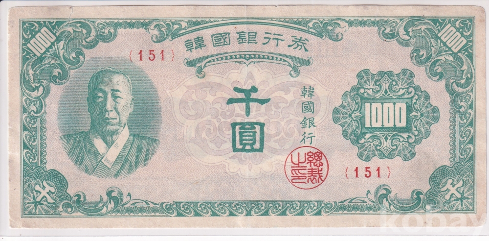 - 최초의 한국은행 천원권 이승만 한복 천원 일본인쇄 판번호 151번 사용제 지폐